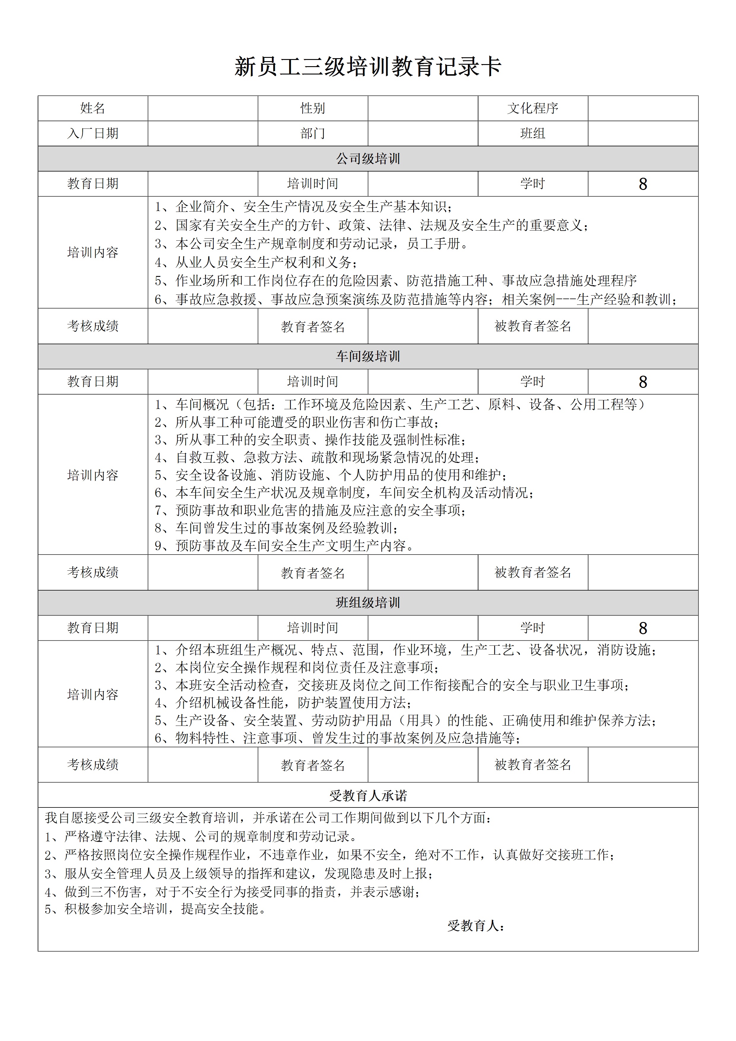 新员工三级安全培训教育记录卡参考[文档]