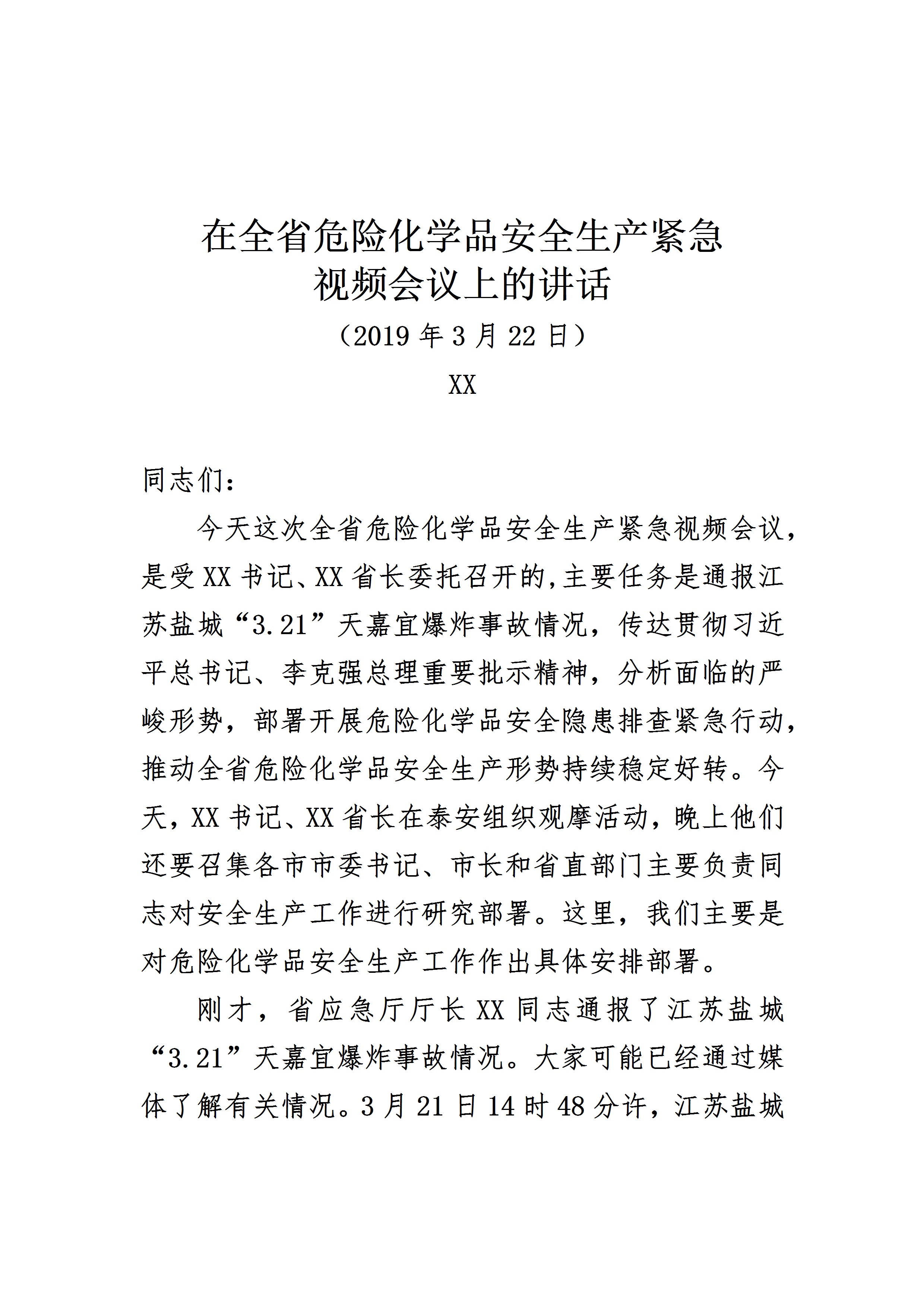 / 在全省危险化学品安全生产紧急视频会议上的讲话[文档版]