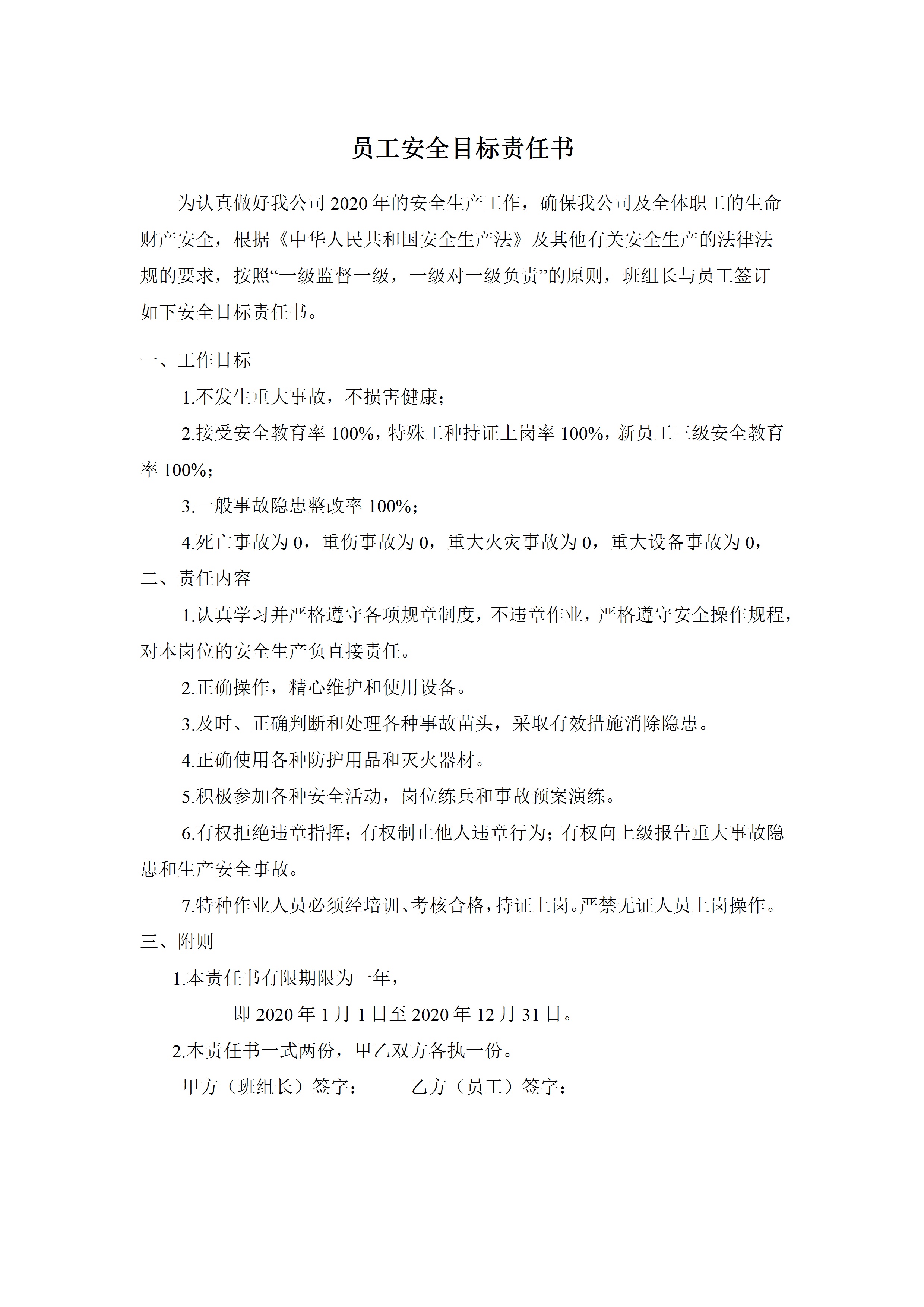 员工安全目标责任书[文档版]