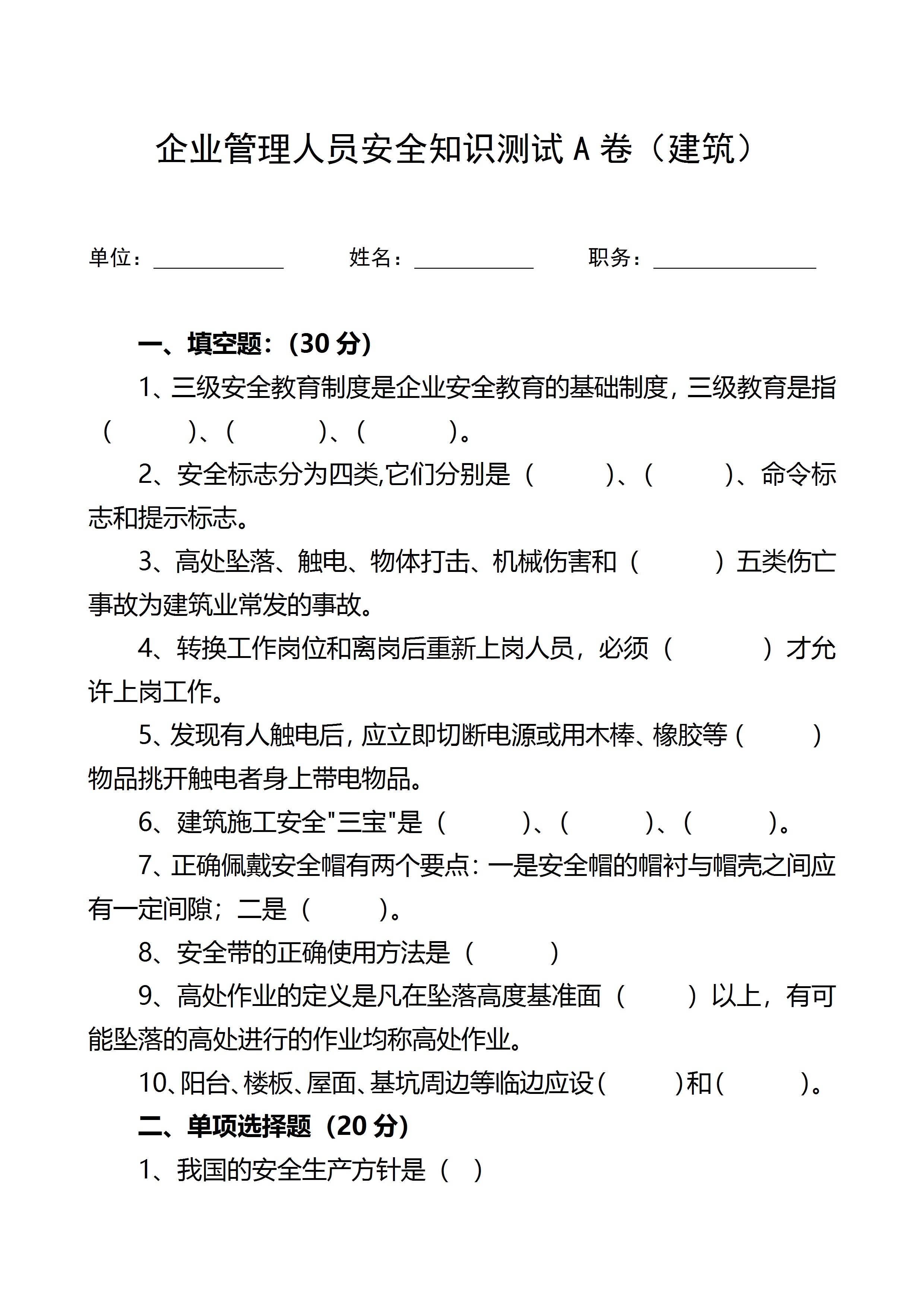 / 管理人员安全生产知识测试试卷A[文档版]