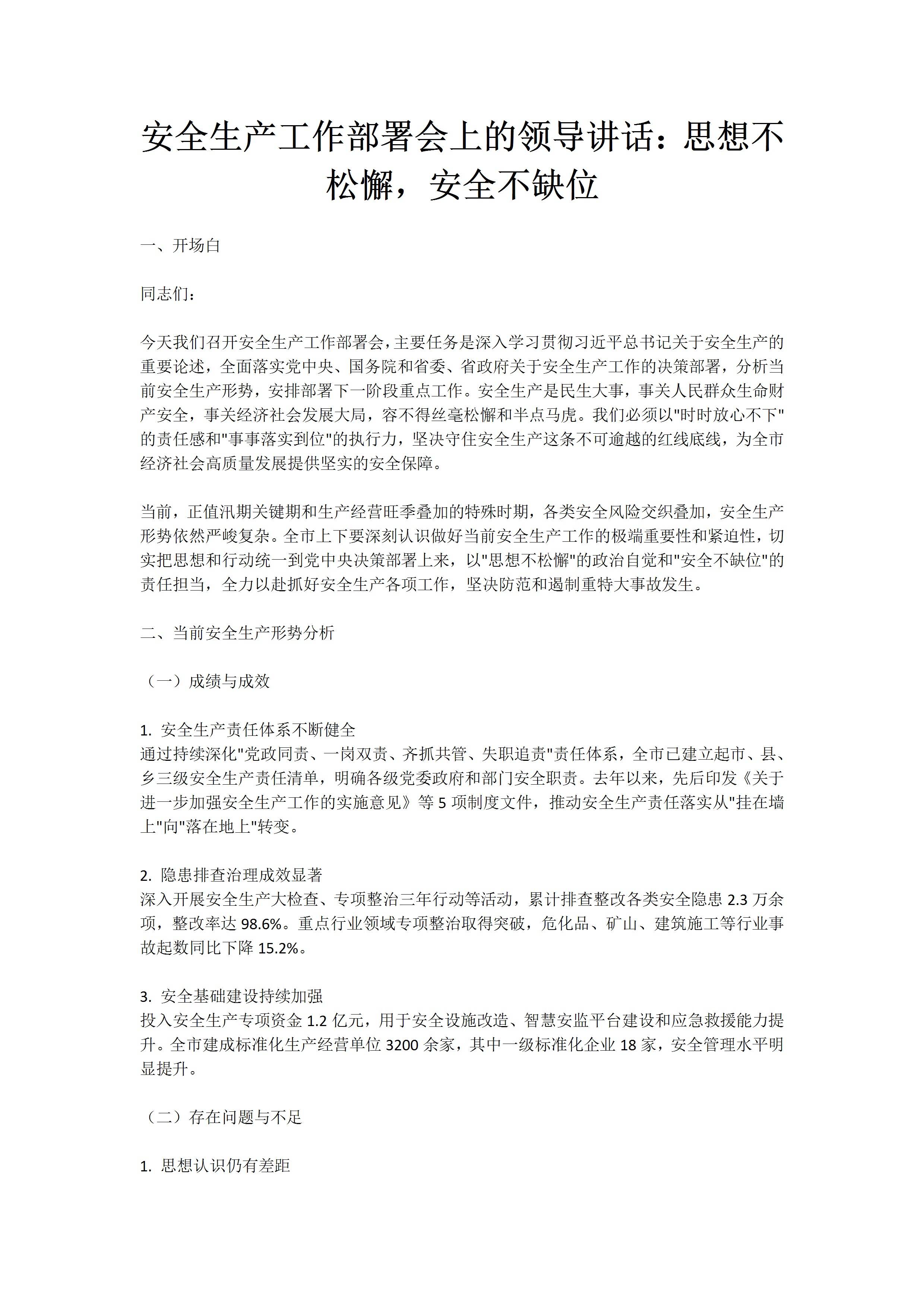 / 安全生产工作部署会上的领导讲话:思想不松懈,安全不缺位