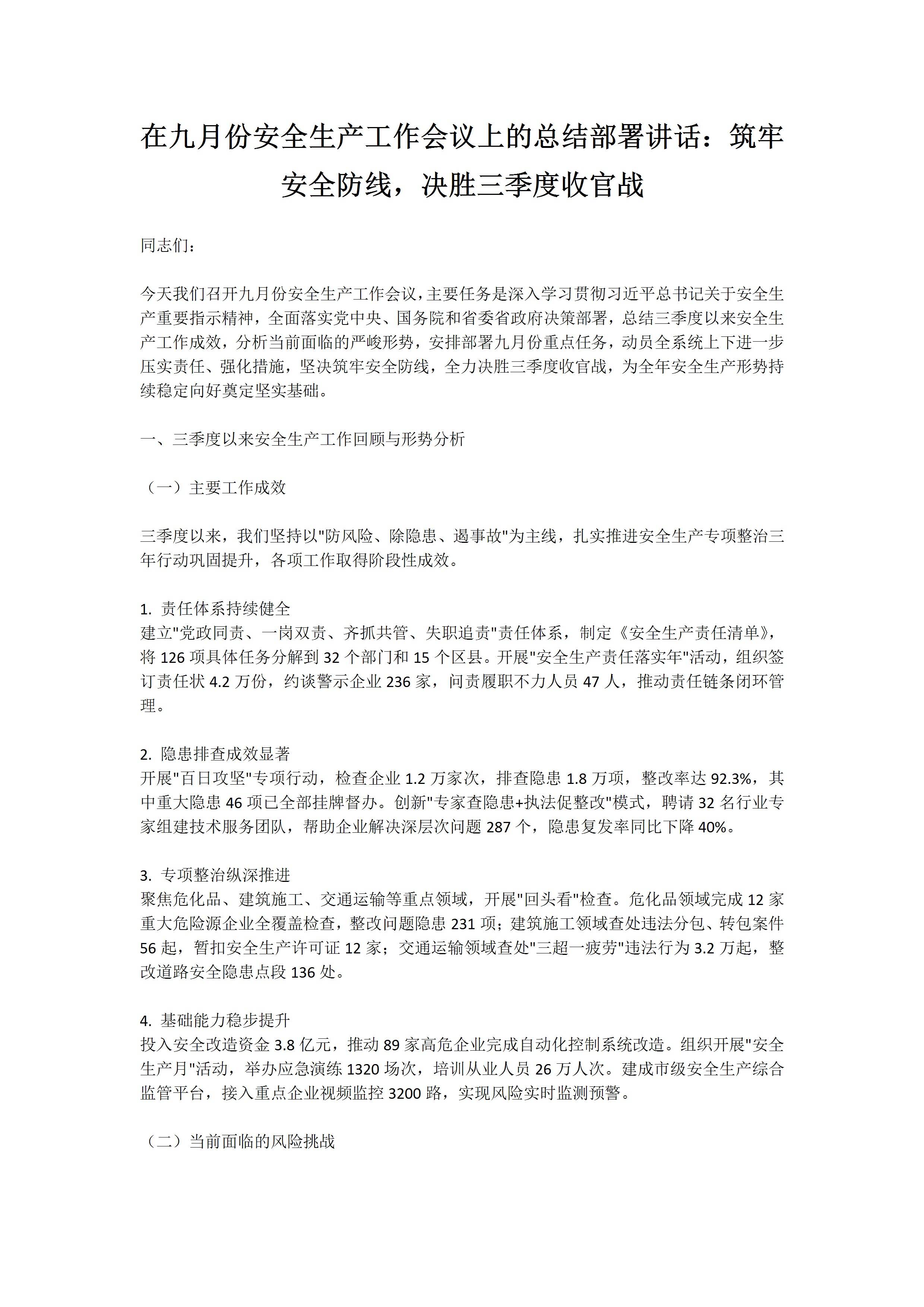 在九月份安全生产工作会议上的总结部署讲话:筑牢安全防线,决胜三季度收官战