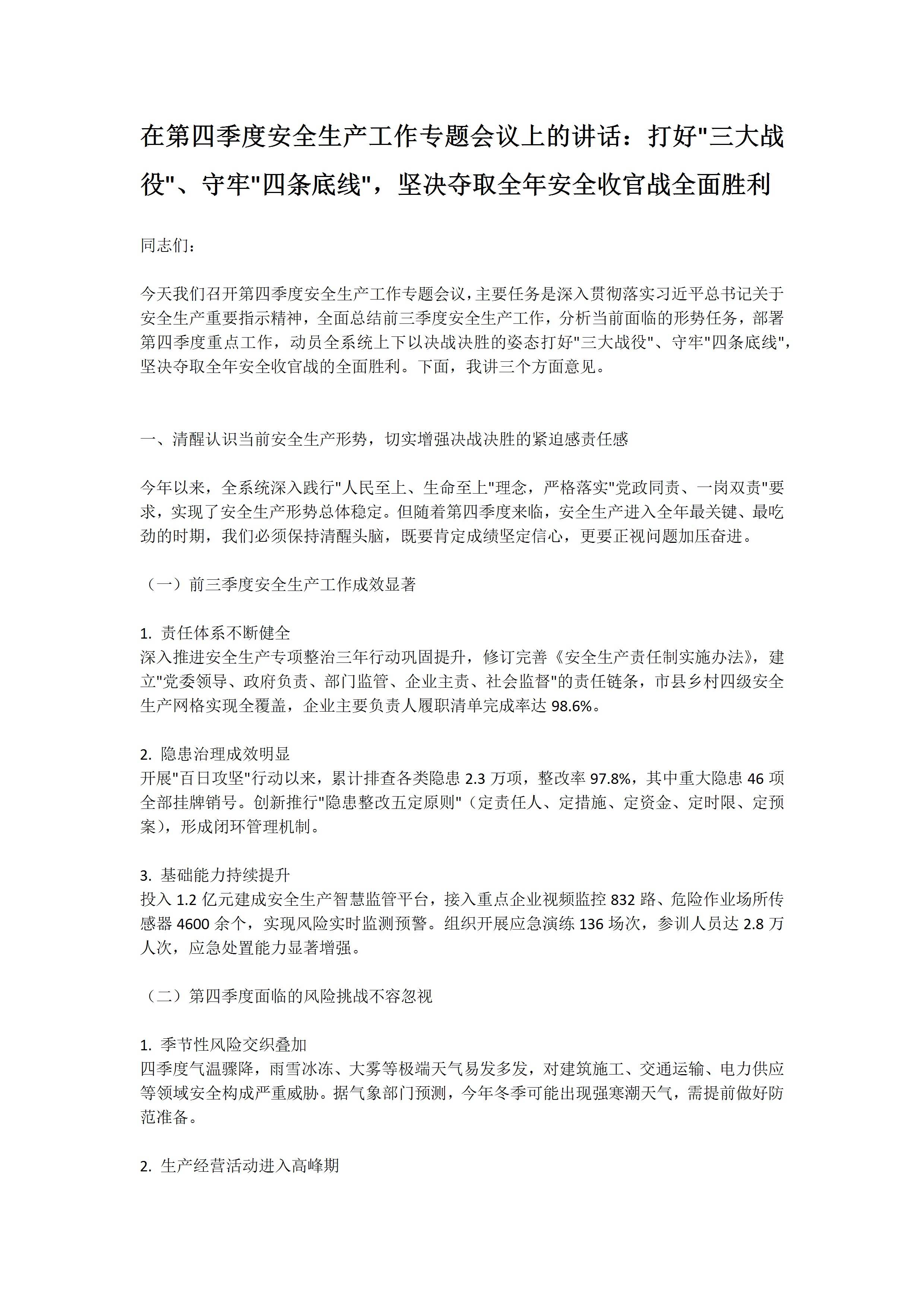 在第四季度安全生产工作专题会议上的讲话:打好三大战役、守牢四条底线,坚决夺取全年安全收官战全面胜利