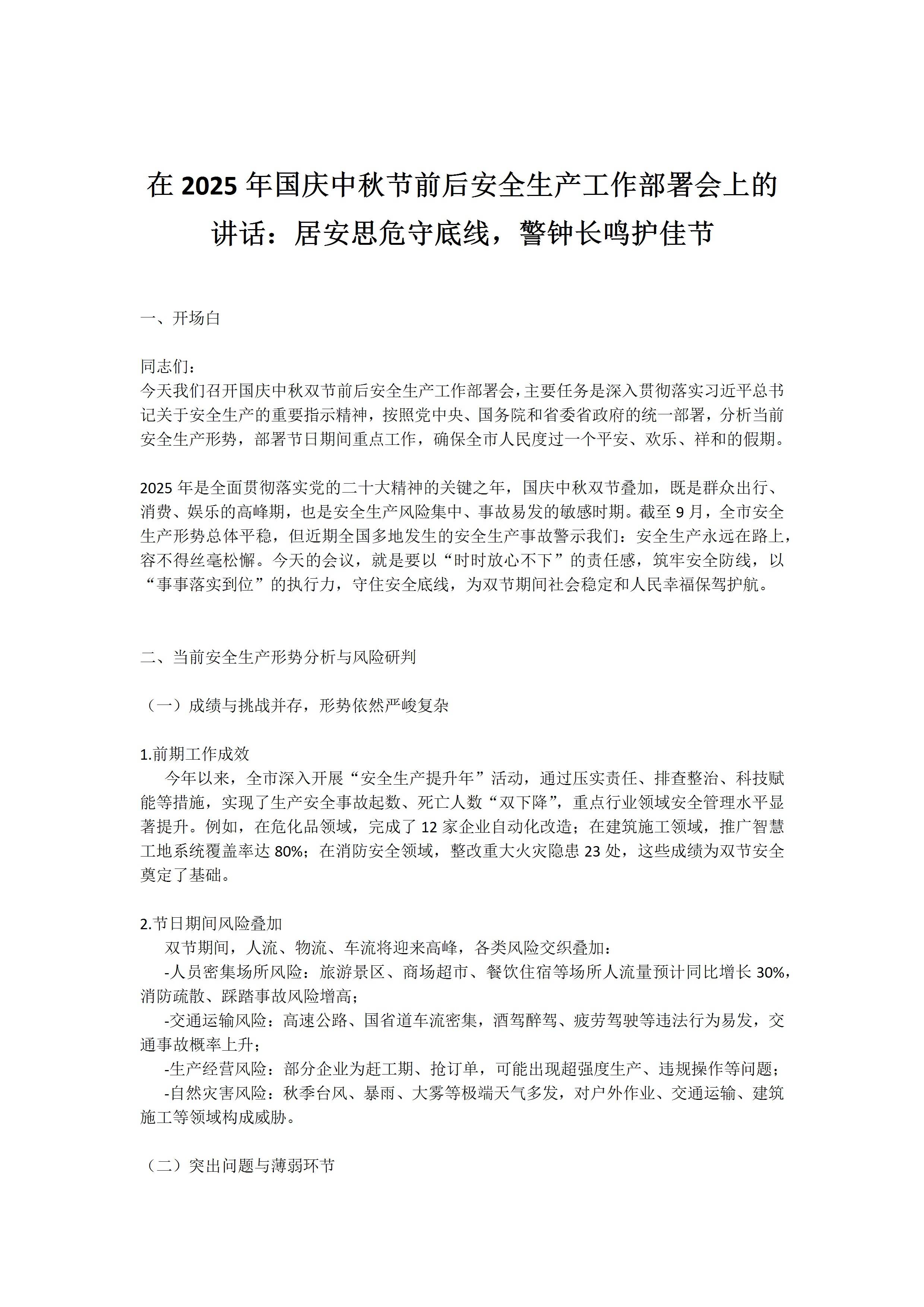 在2025年国庆中秋节前后安全生产工作部署会上的讲话:居安思危守底线,警钟长鸣护佳节