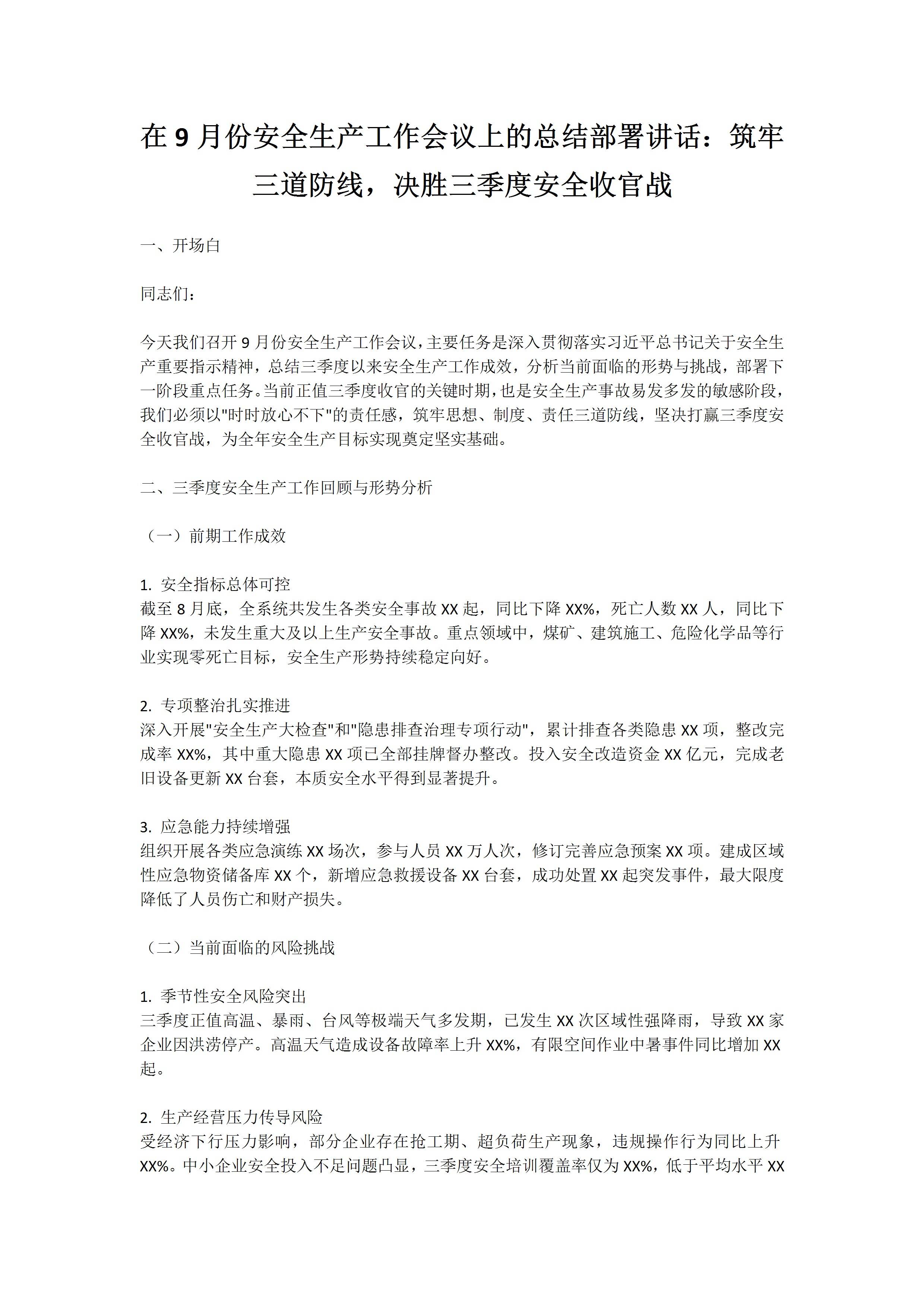 在9月份安全生产工作会议上的总结部署讲话:筑牢三道防线,决胜三季度安全收官战