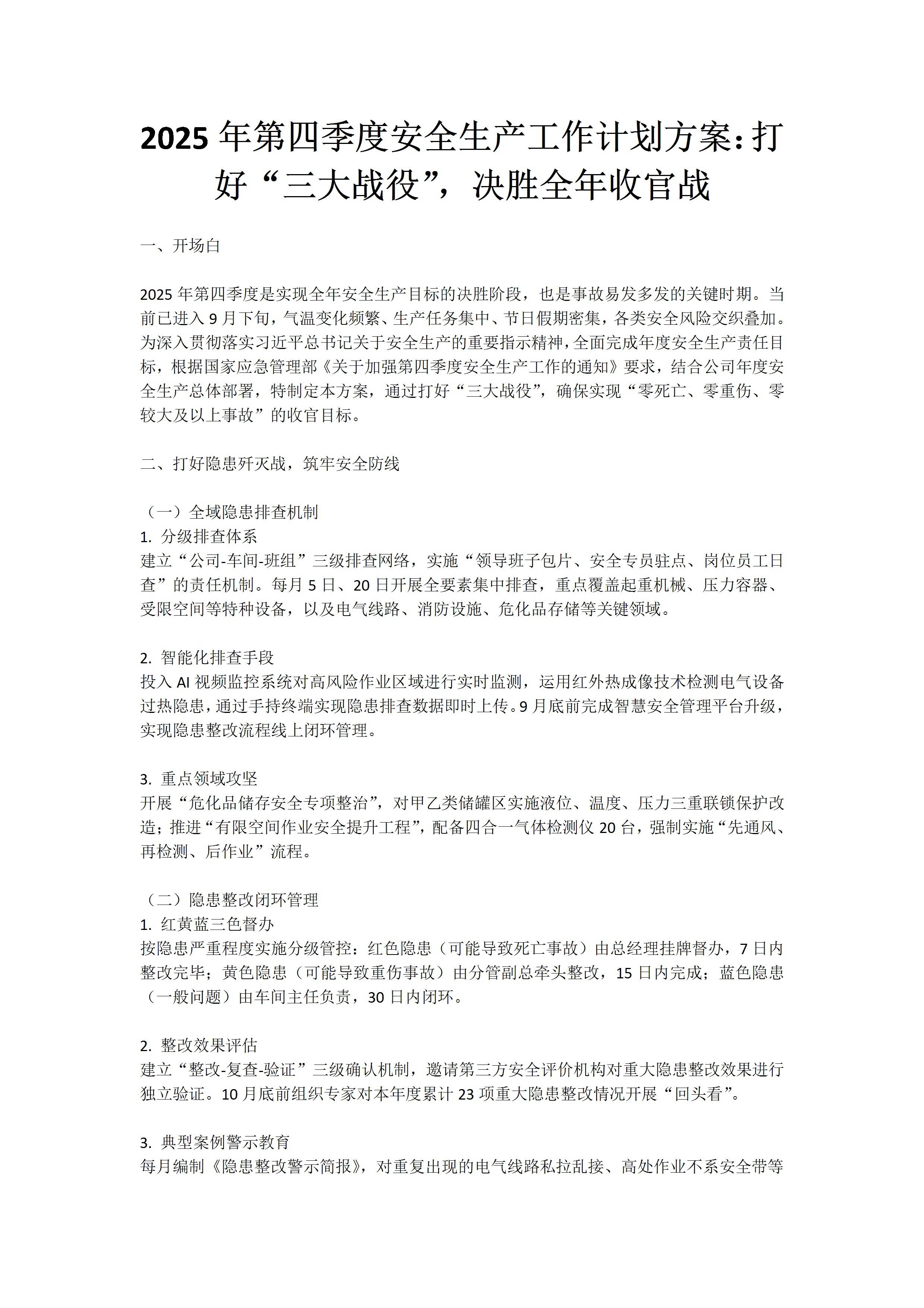 2025年第四季度安全生产工作计划方案:打好“三大战役”,决胜全年收官战