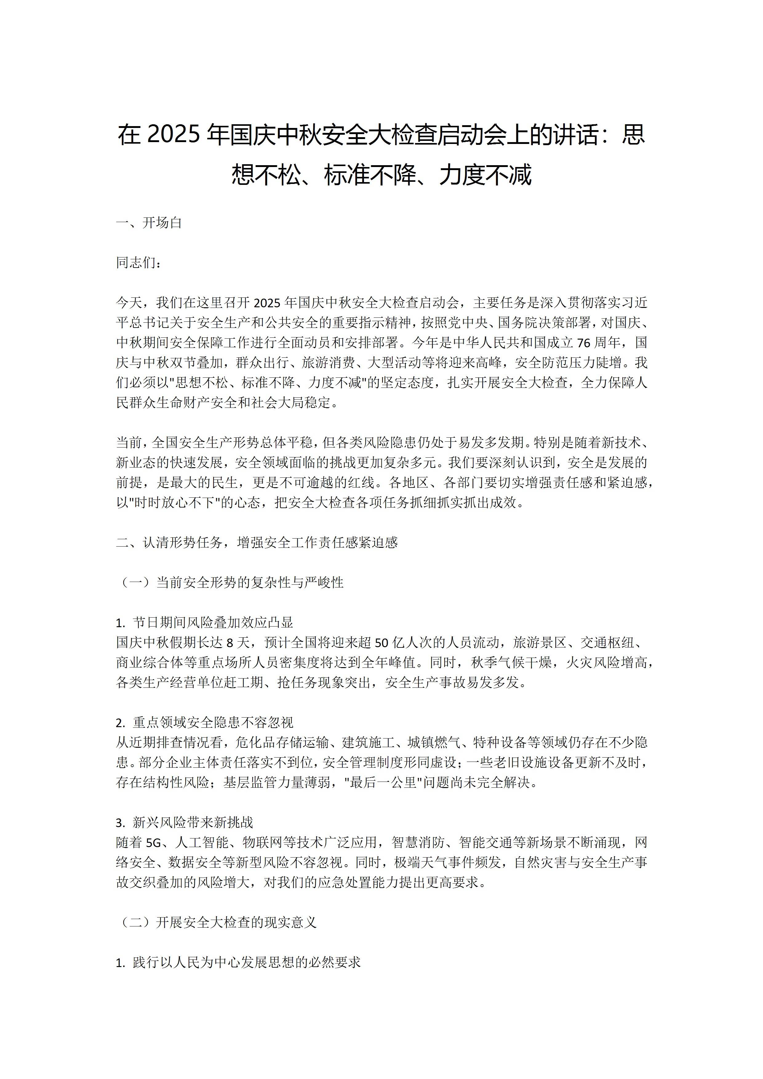 在2025年国庆中秋安全大检查启动会上的讲话:思想不松、标准不降、力度不减