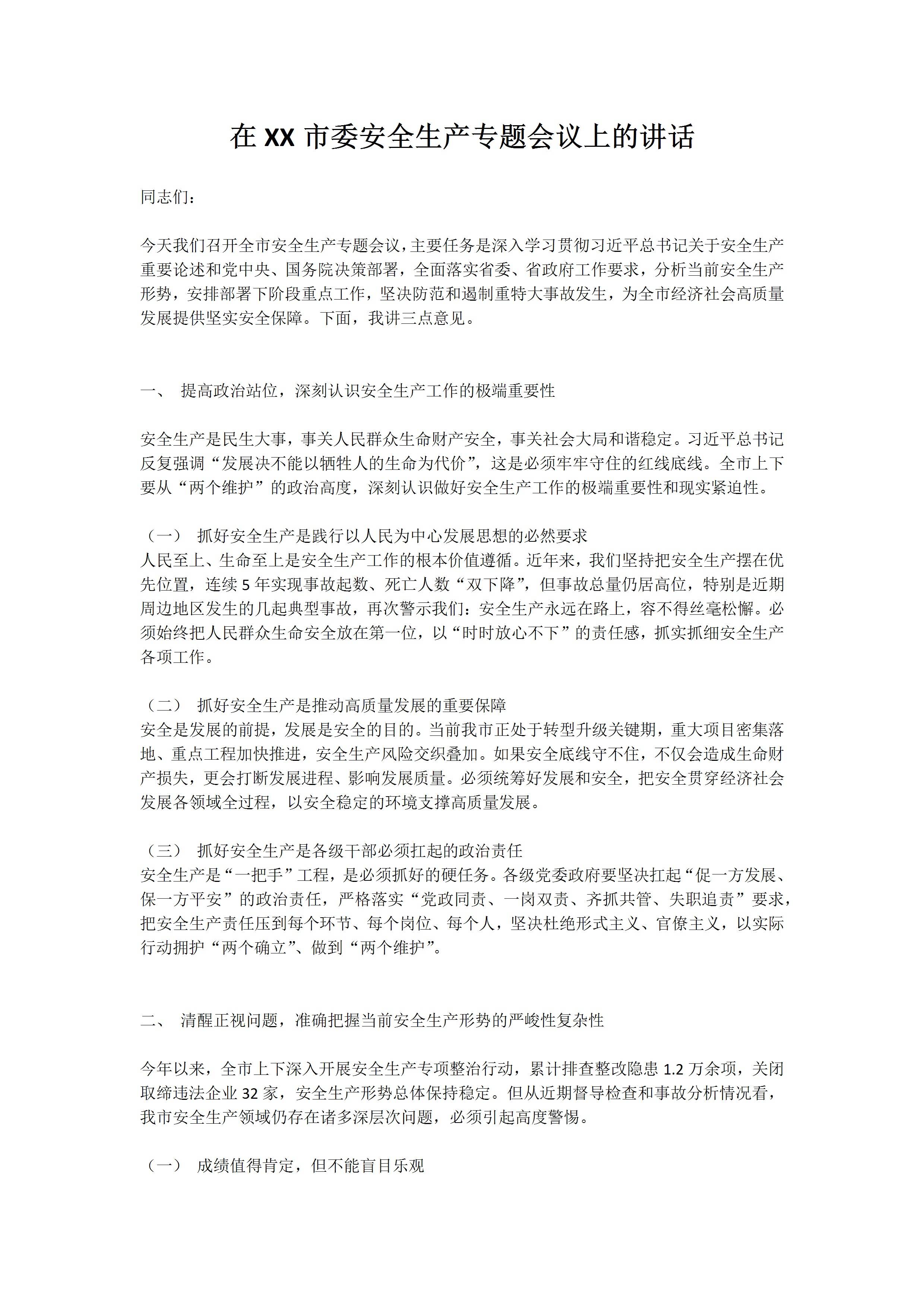 / 在XX市委安全生产专题会议上的讲话[文档]