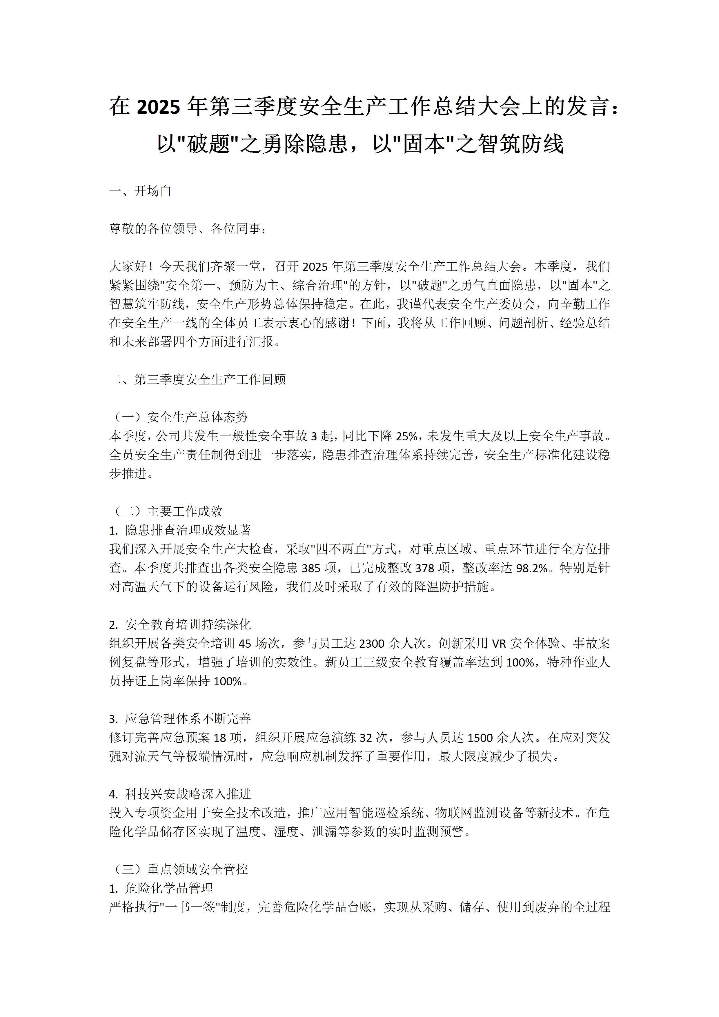 在2025年第三季度安全生产工作总结大会上的发言,以破题之勇除隐患,以固本之智筑防线9.27 文档