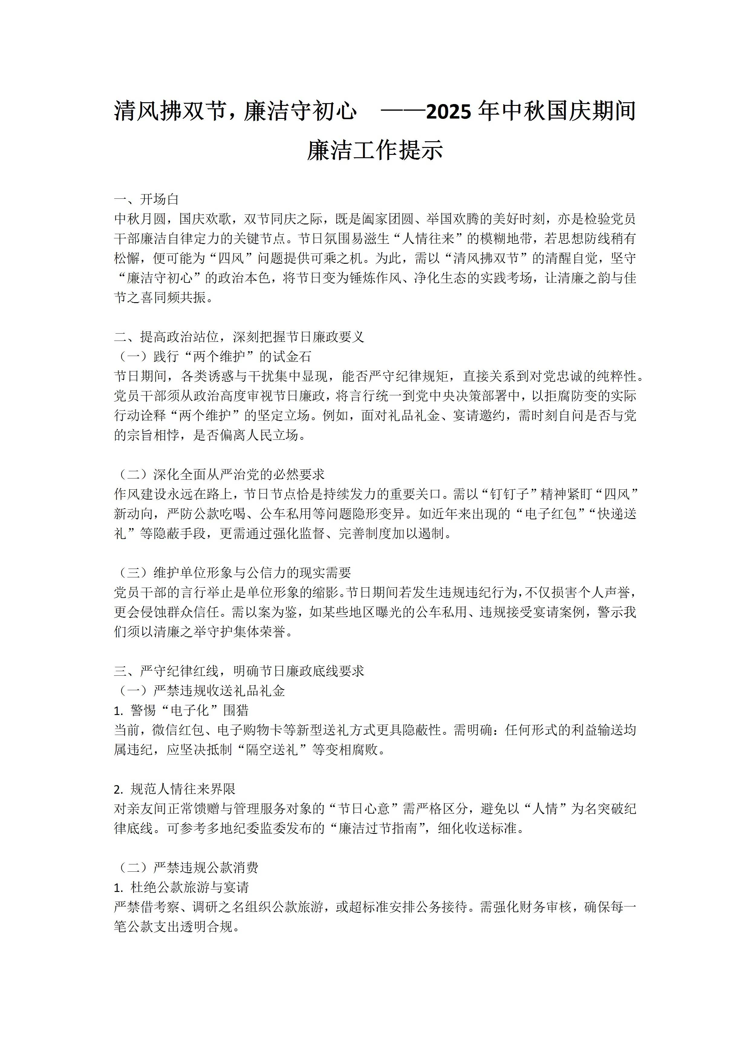 清风拂双节,廉洁守初心,2025年中秋国庆期间廉洁工作提示9.27 文档