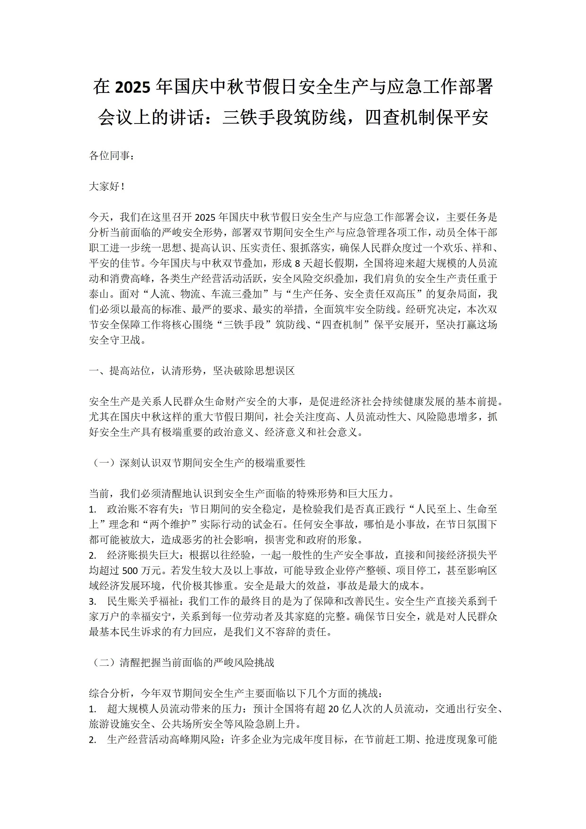 在2025年国庆中秋节假日安全生产与应急工作部署会议上的讲话,三铁手段筑防线,四查机制保平安9.27 文档