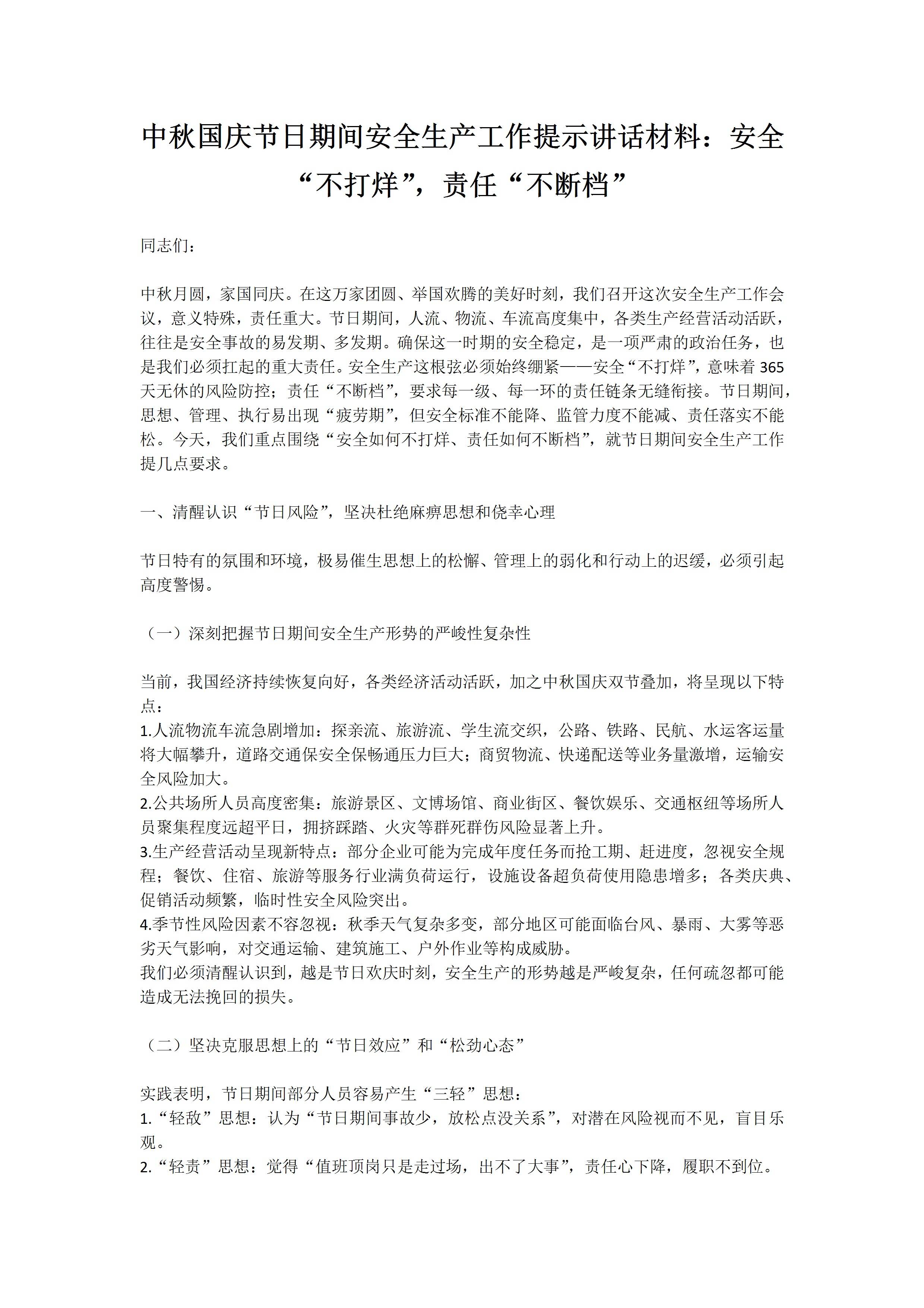 中秋国庆节日期间安全生产工作提示讲话材料,安全不打烊,责任不断档9.27 文档