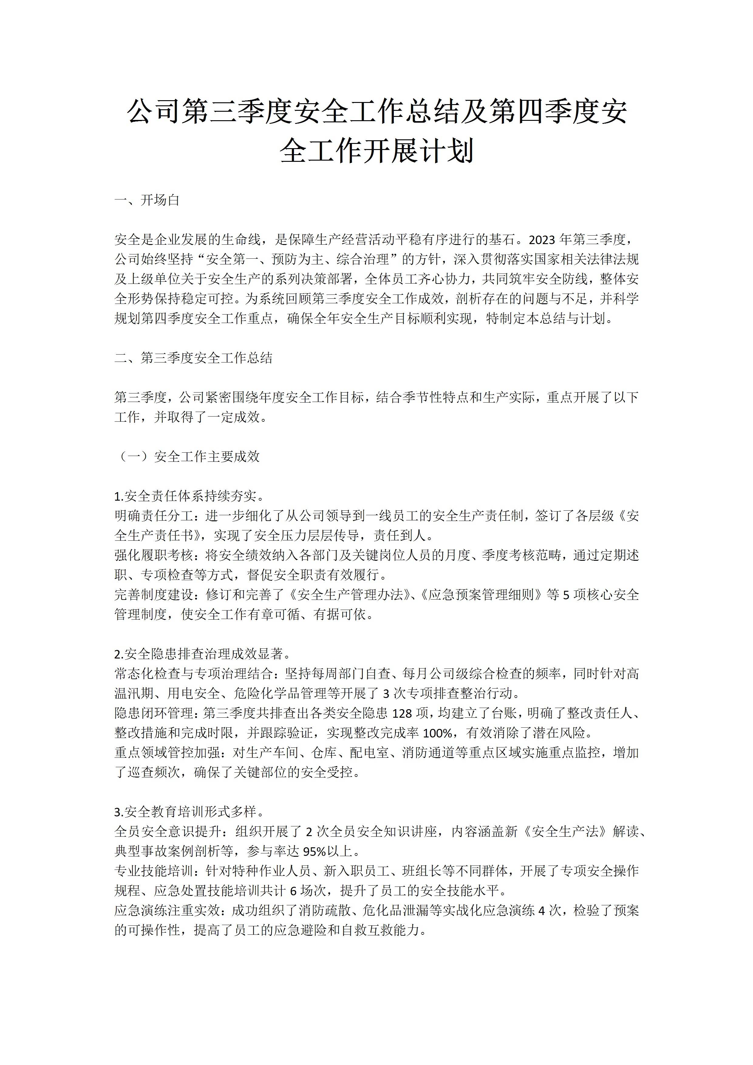 / 公司第三季度安全工作总结及第四季度安全工作开展计划9.27 文档