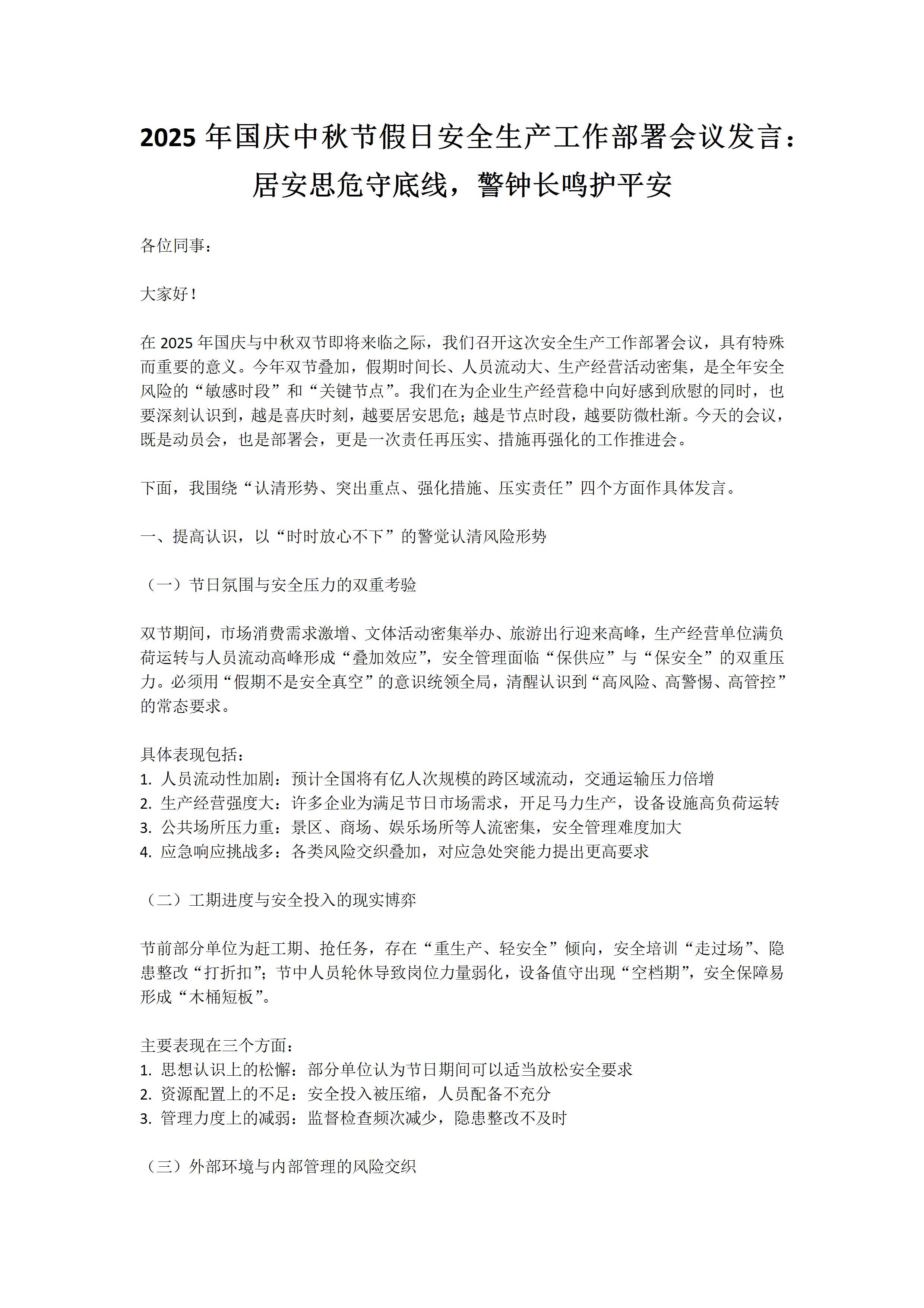 2025年国庆中秋节假日安全生产工作部署会议发言,居安思危守底线,警钟长鸣护平安9.27 文档