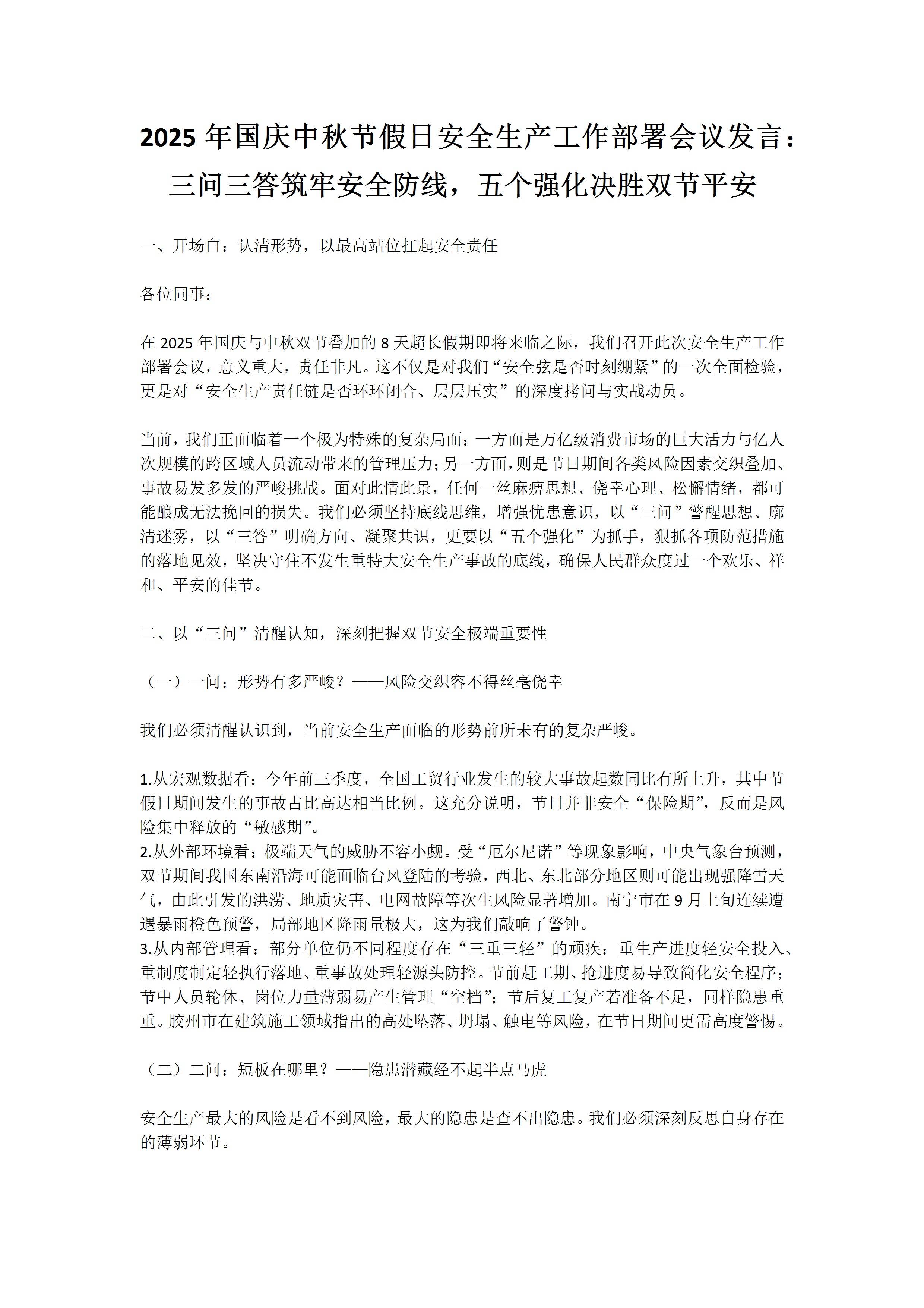 2025年国庆中秋节假日安全生产工作部署会议发言,三问三答筑牢安全防线,五个强化决胜双节平安9.27 文档