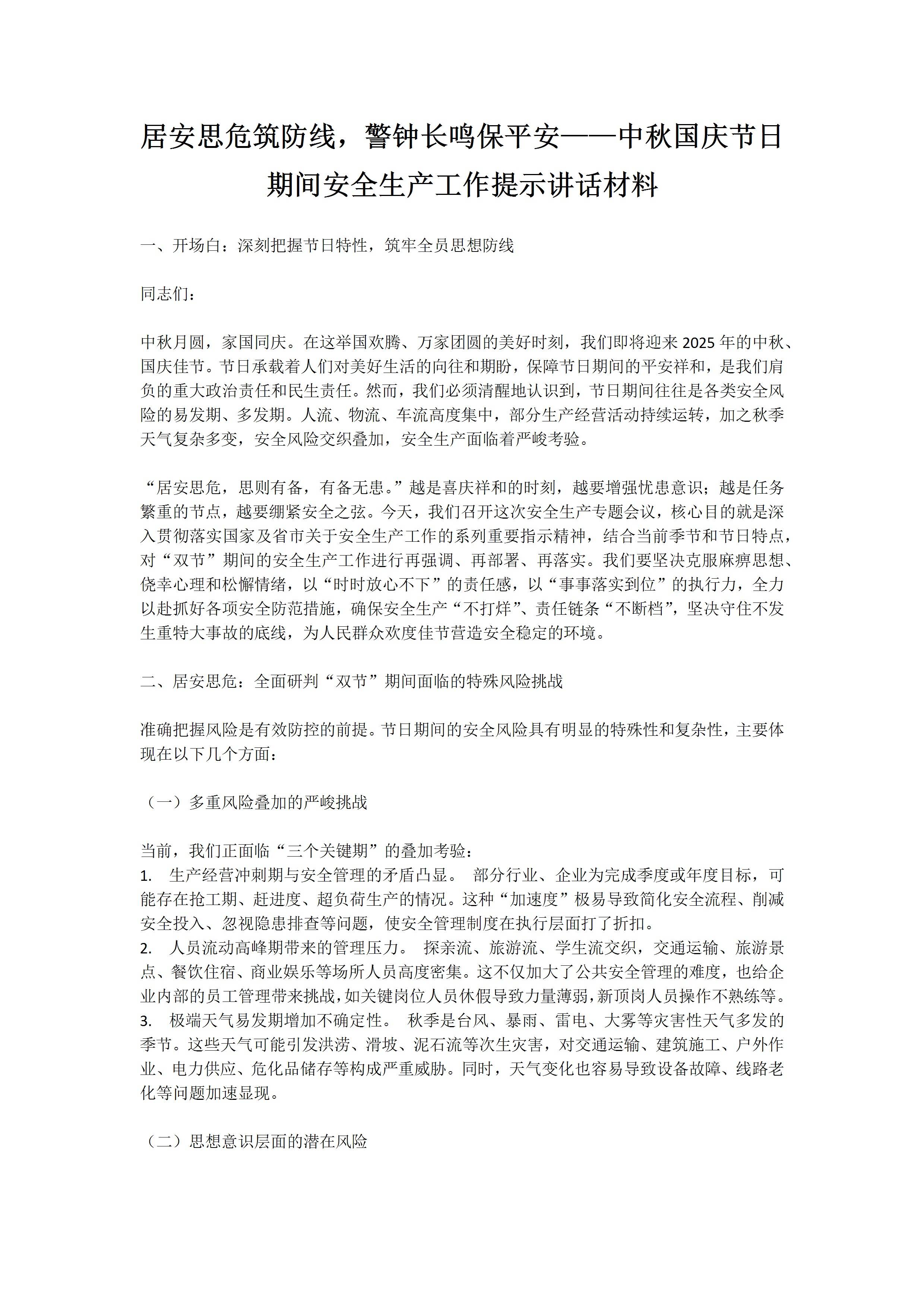 居安思危筑防线,警钟长鸣保平安——中秋国庆节日期间安全生产工作提示讲话材料9.29 文档