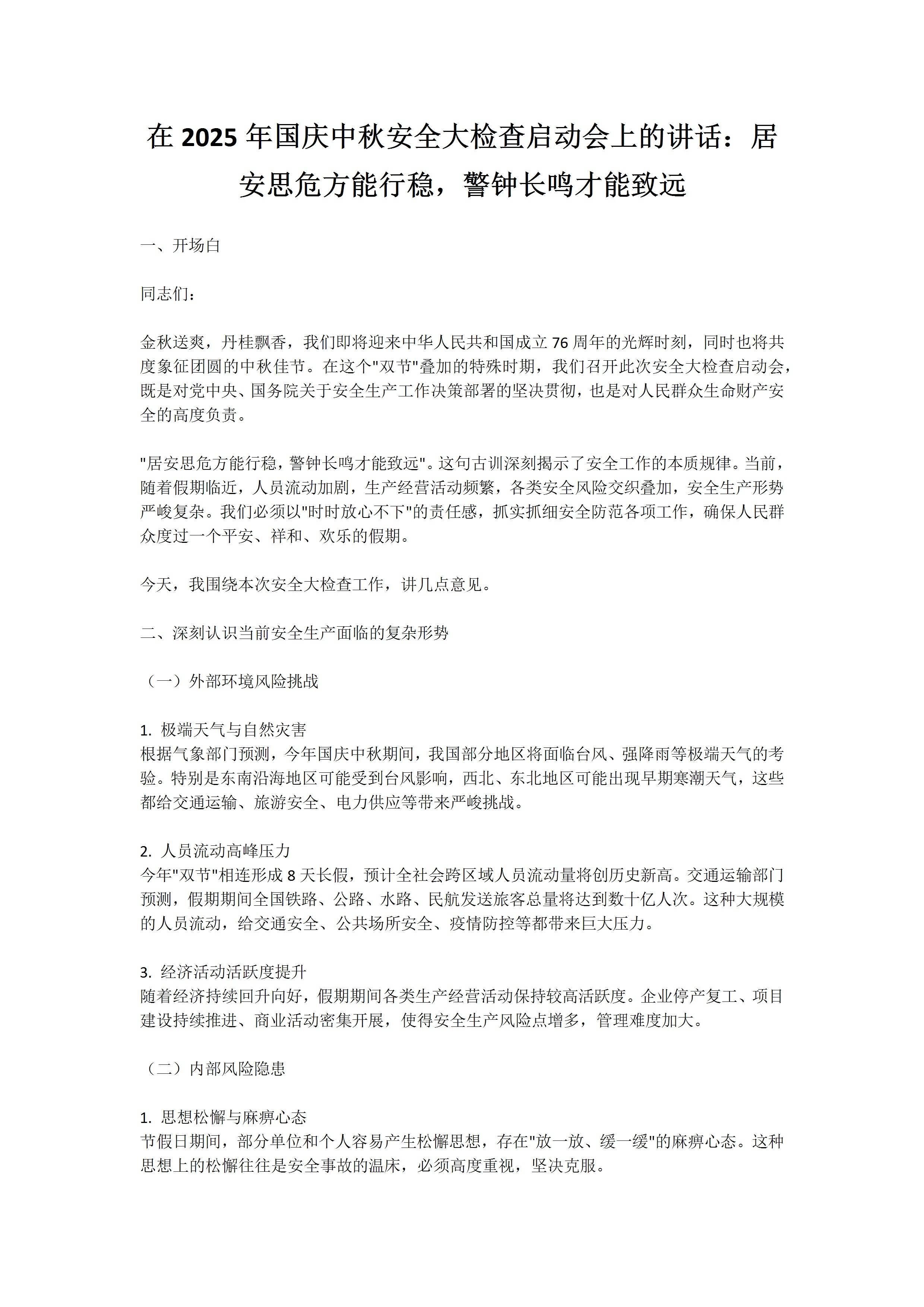 在2025年国庆中秋安全大检查启动会上的讲话居安思危方能行稳,警钟长鸣才能致远9.29 文档