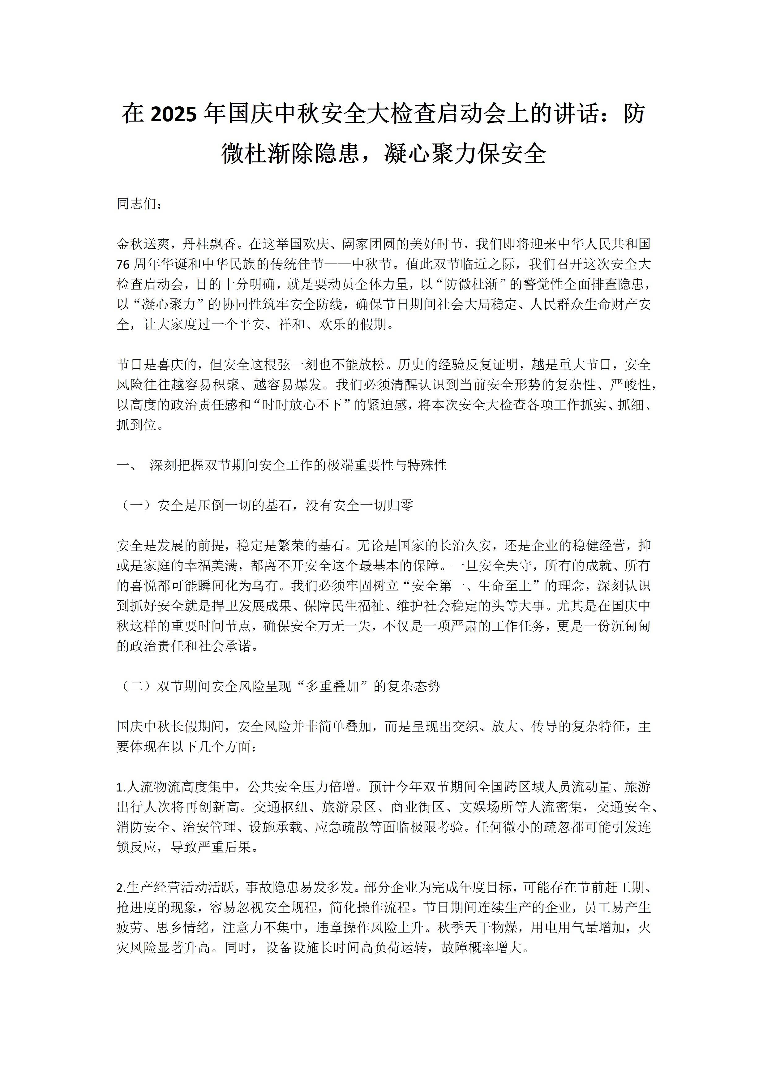 在2025年国庆中秋安全大检查启动会上的讲话防微杜渐除隐患,凝心聚力保安全9.29 文档