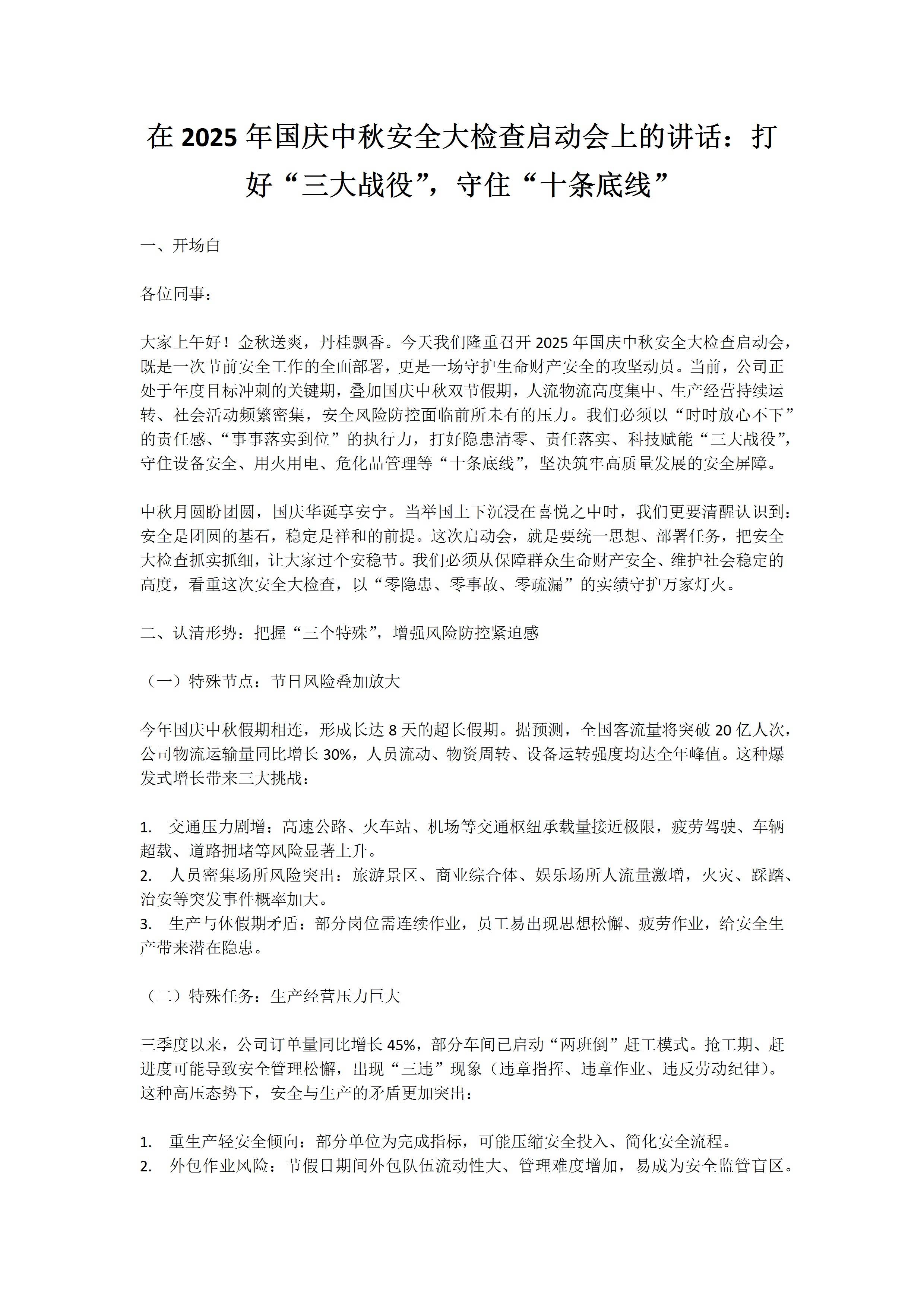 在2025年国庆中秋安全大检查启动会上的讲话打好三大战役,守住十条底线9.29 文档