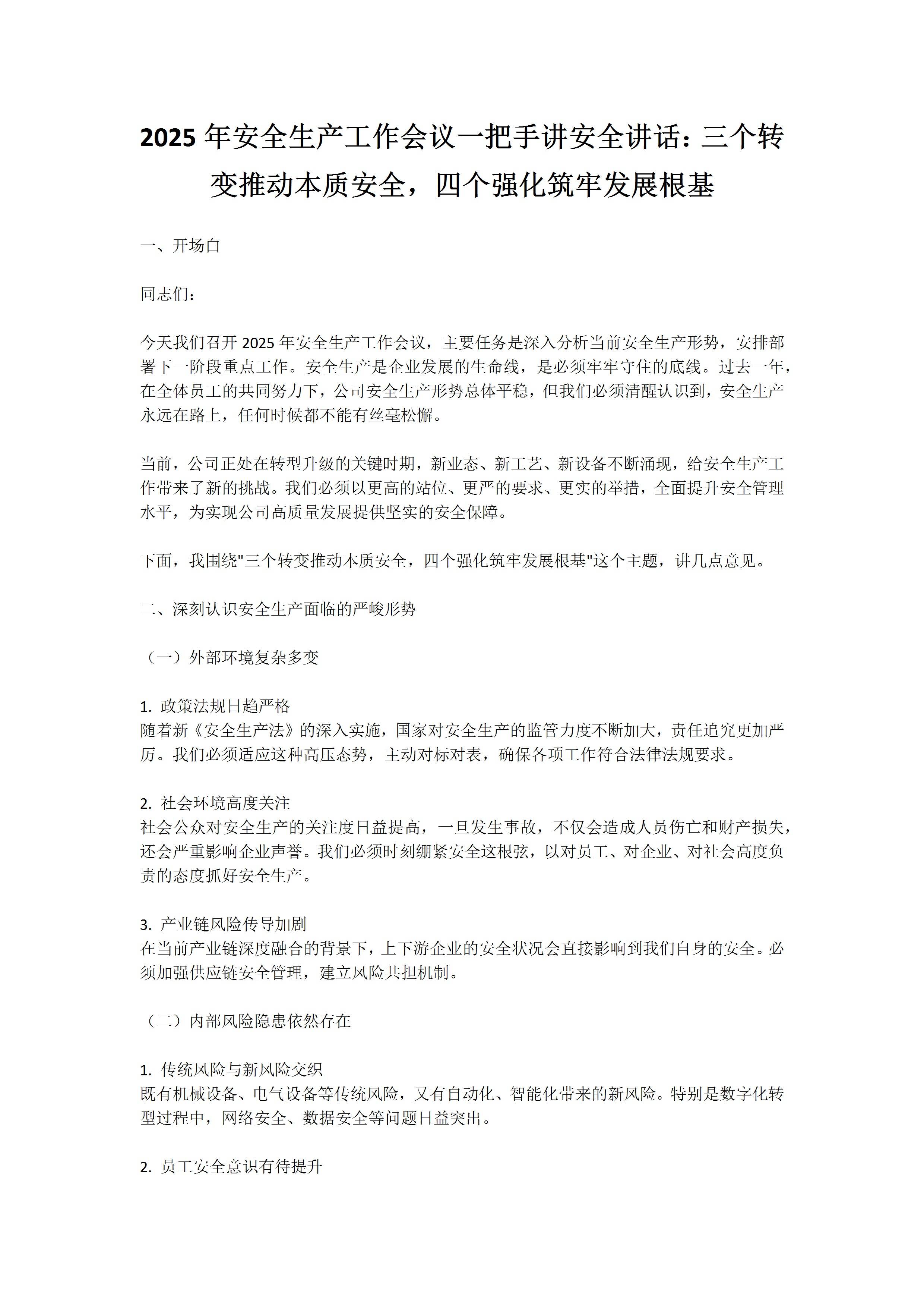 2025年安全生产工作会议一把手讲安全讲话三个转变推动本质安全,四个强化筑牢发展根基9.29 文档