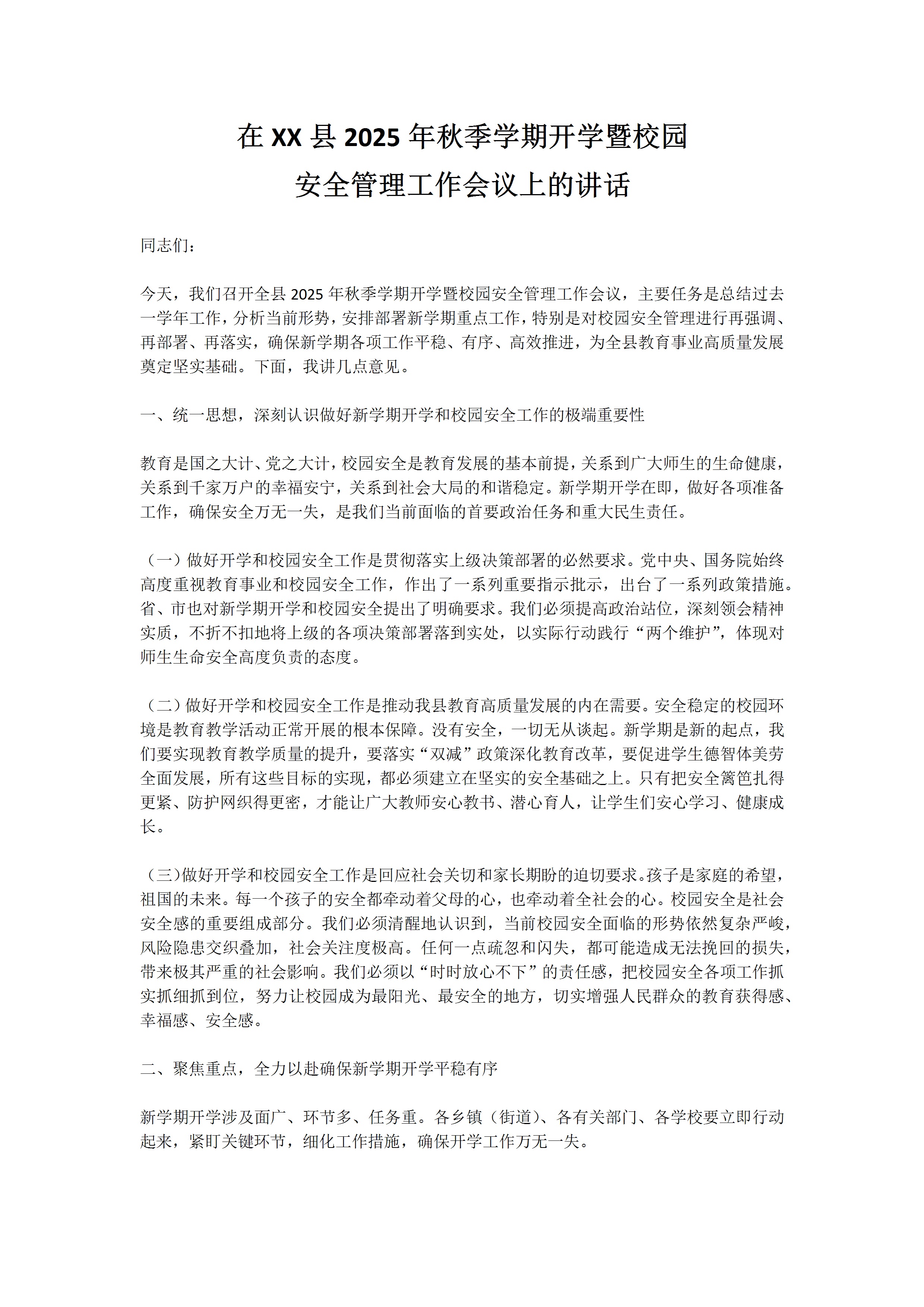 在xx县2025年秋季学期开学暨校园安全管理工作会议上的讲话3.3 0 文档