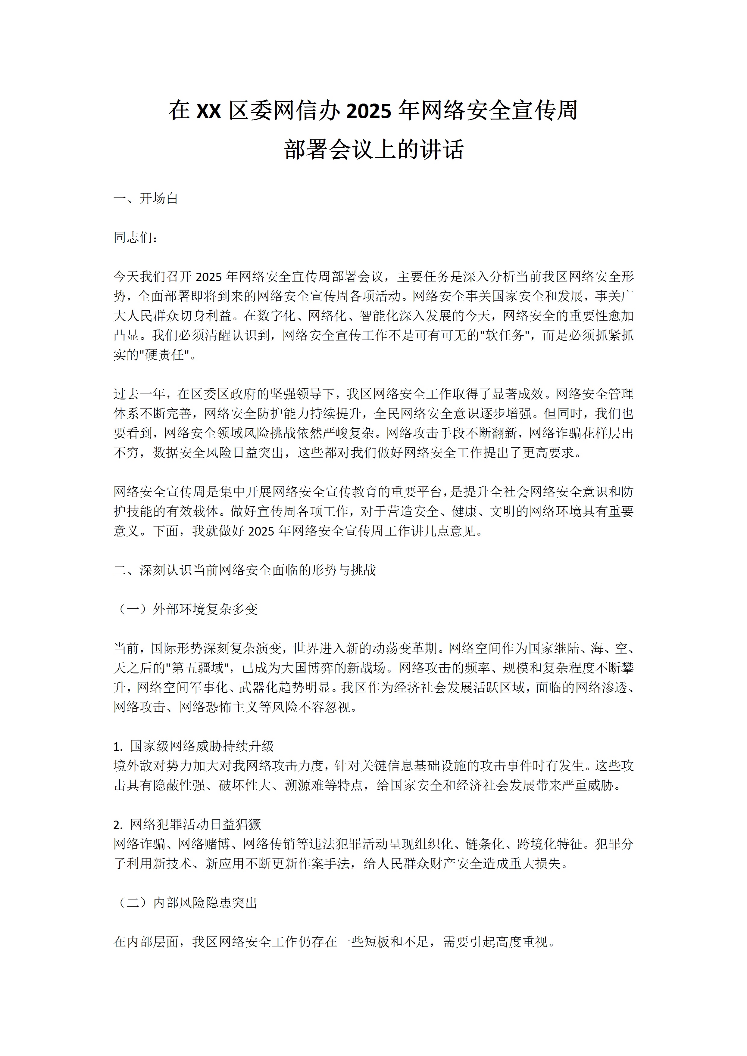在xx区委网信办2025年网络安全宣传周部署会议上的讲话3.3 0 文档