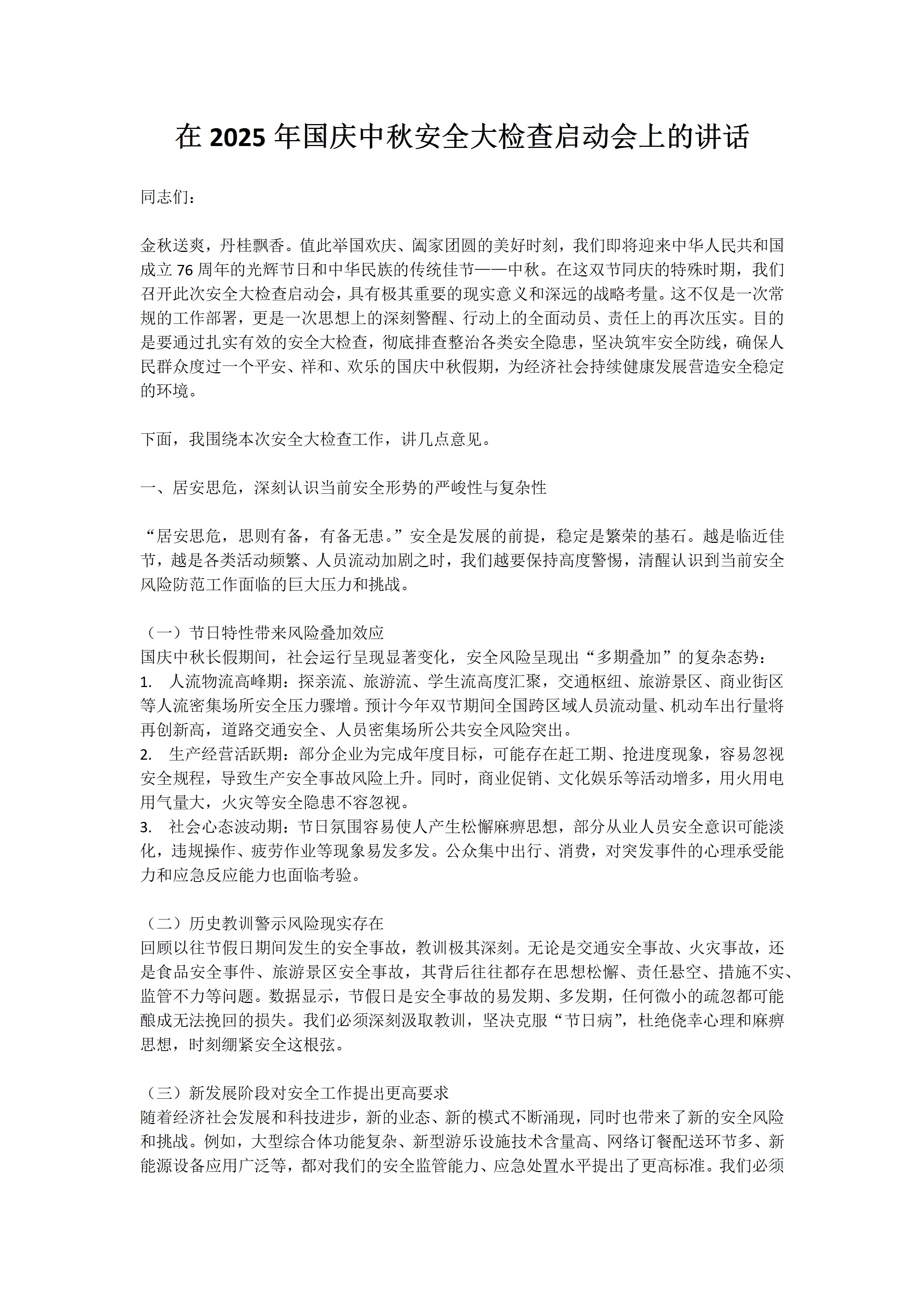 / 在2025年国庆中秋安全大检查启动会上的讲话3.3 0 文档