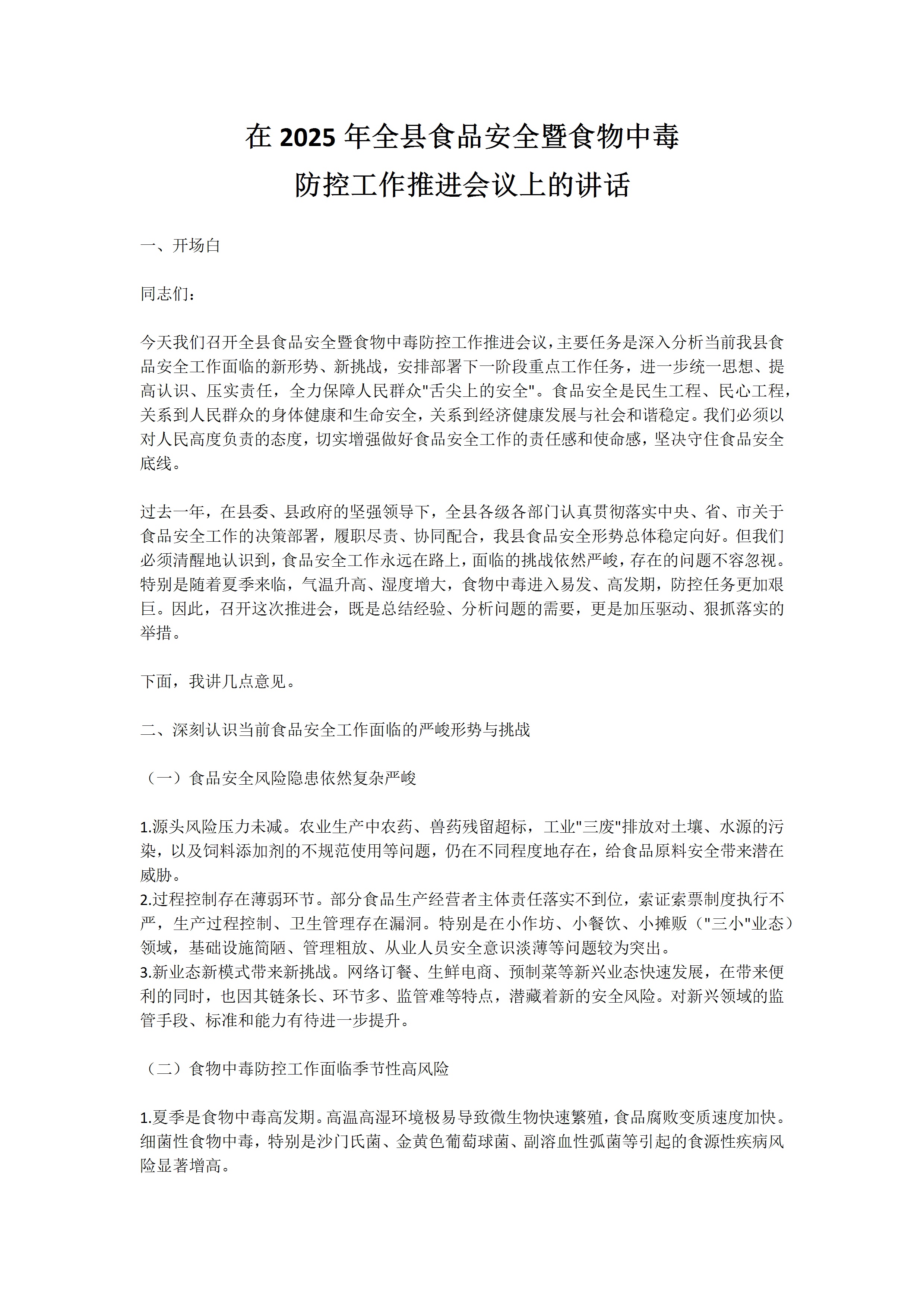在2025年全县食品安全暨食物中毒防控工作推进会议上的讲话3.3 0 文档
