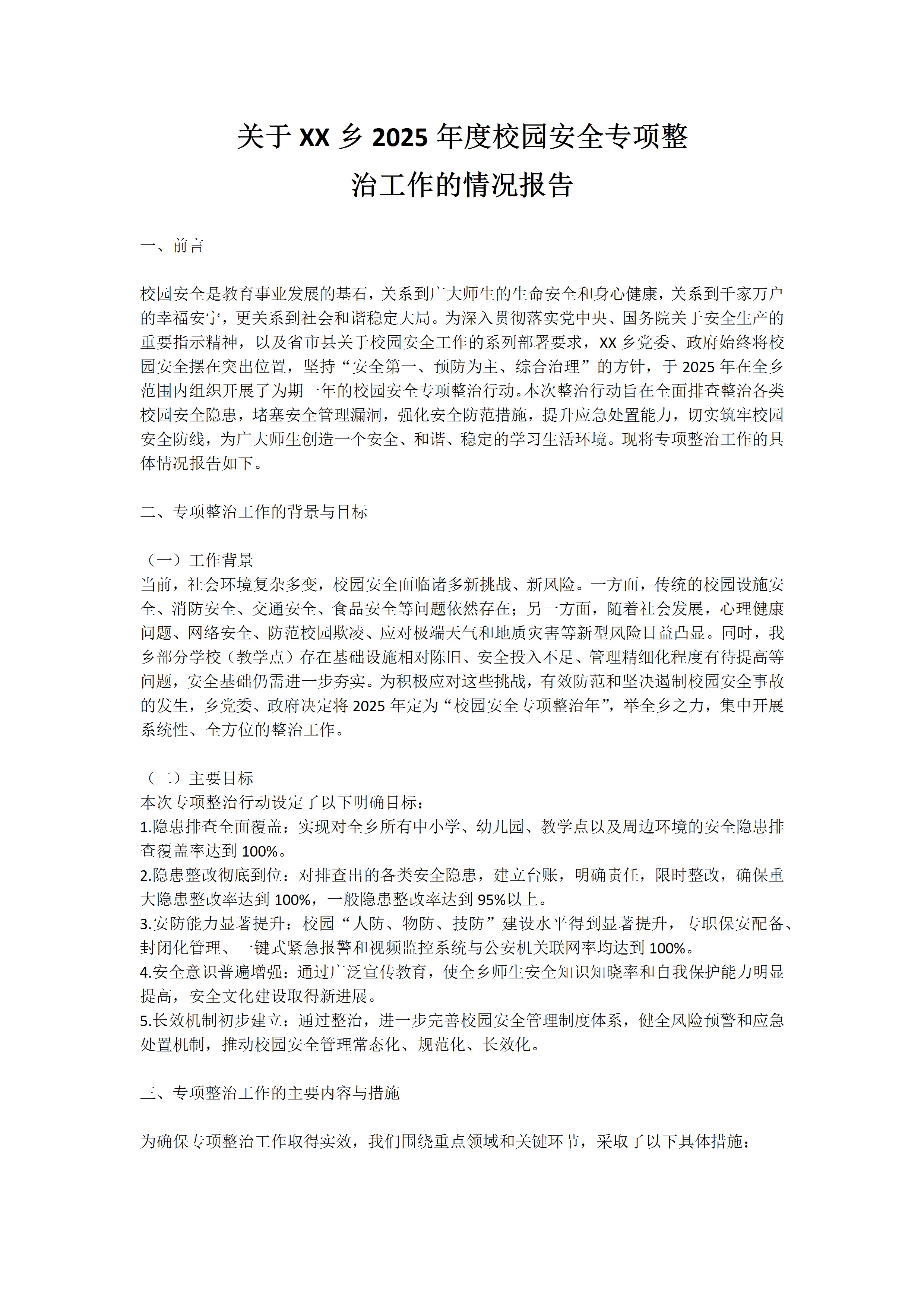 关于xx乡2025年度校园安全专项整治工作的情况报告3.3 0 文档