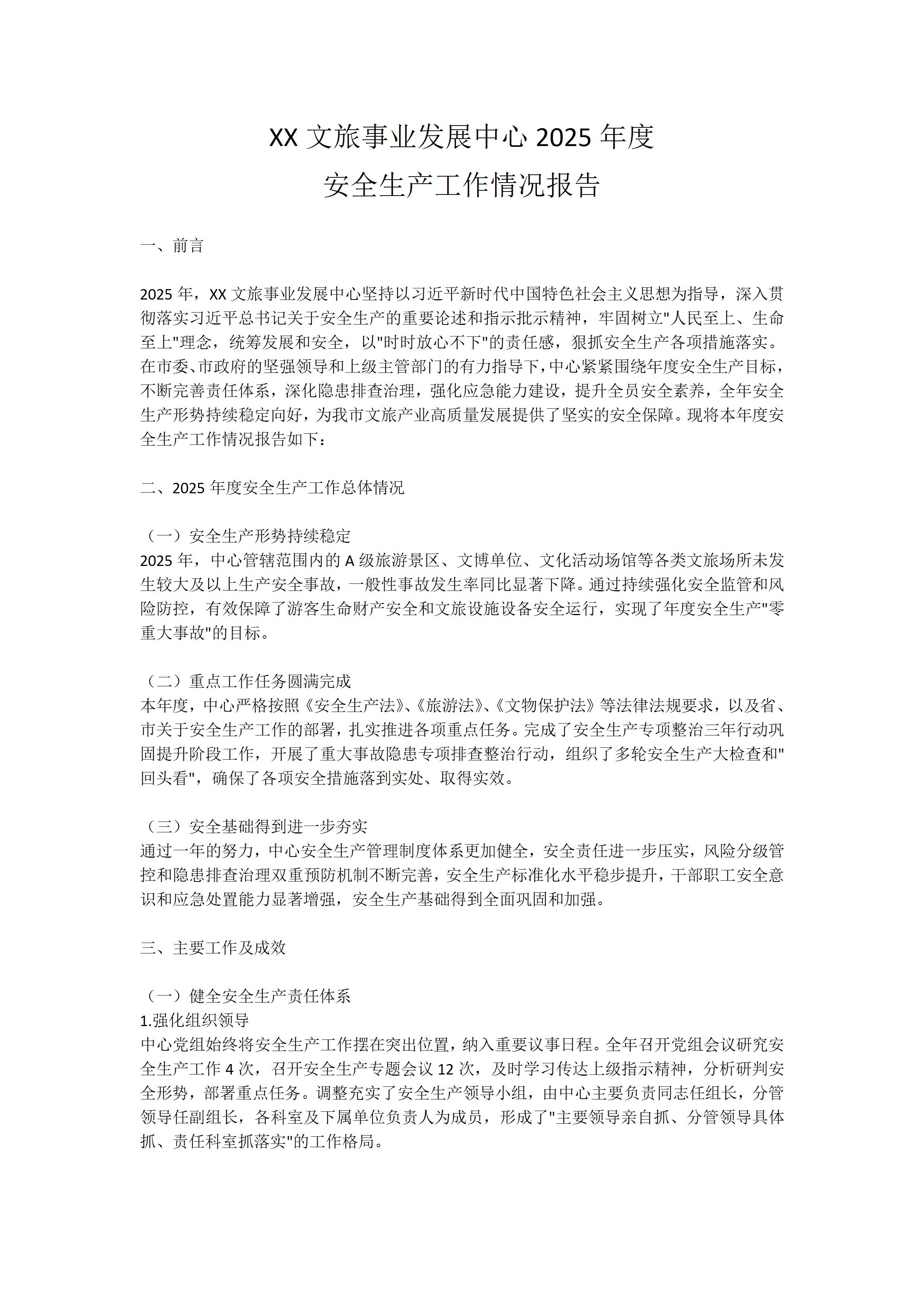 xx文旅事业发展中心2025年度安全生产工作情况报告3.3 0 文档