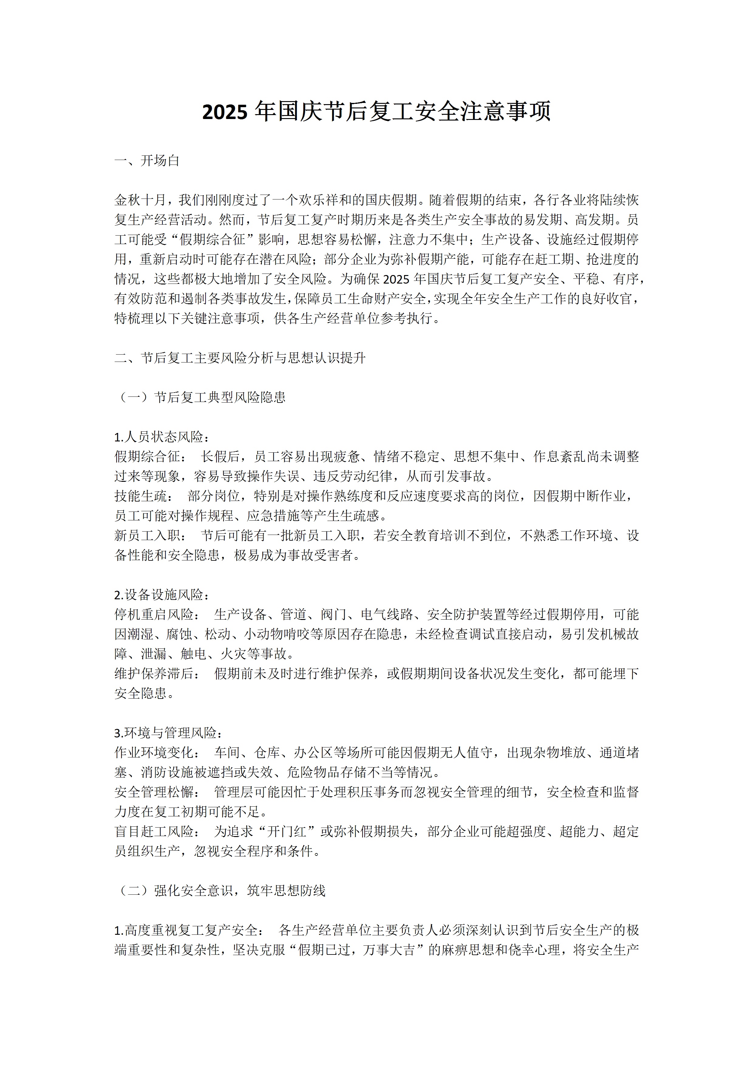 / 2025年国庆节后复工安全注意事项3.3 0 文档