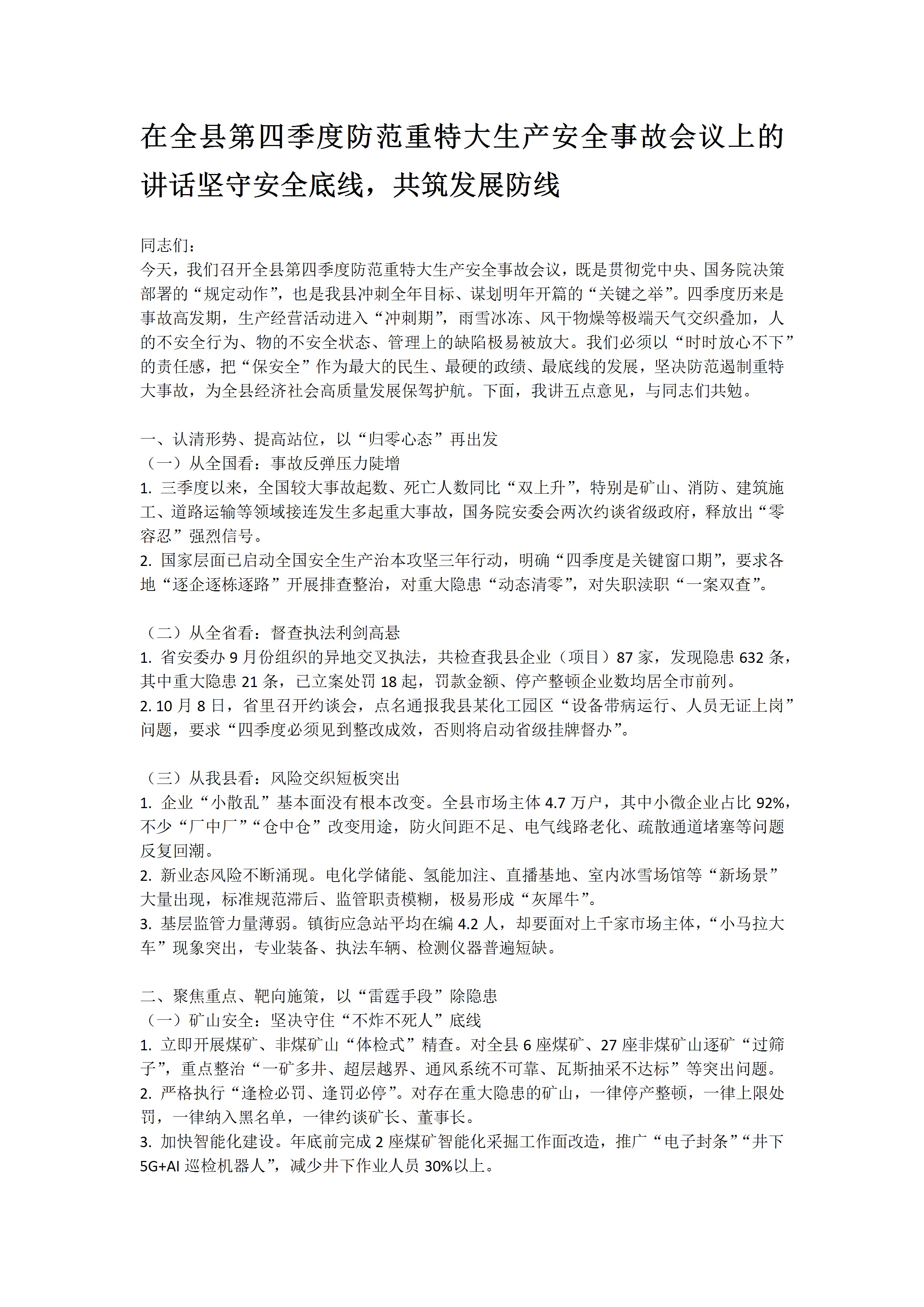 在全县第四季度防范重特大生产安全事故会议上的讲话坚守安全底线,共筑发展防线 文档25.10.10