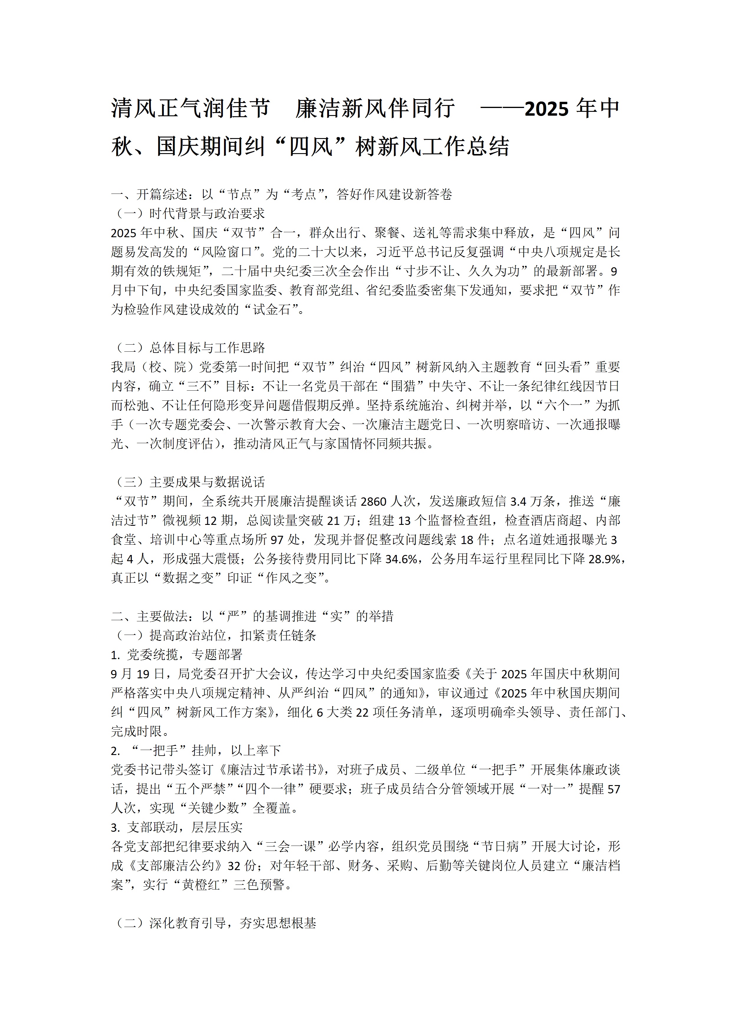 清风正气润佳节 廉洁新风伴同行2025年中秋,国庆期间纠四风树新风工作总结 文档25.10.10