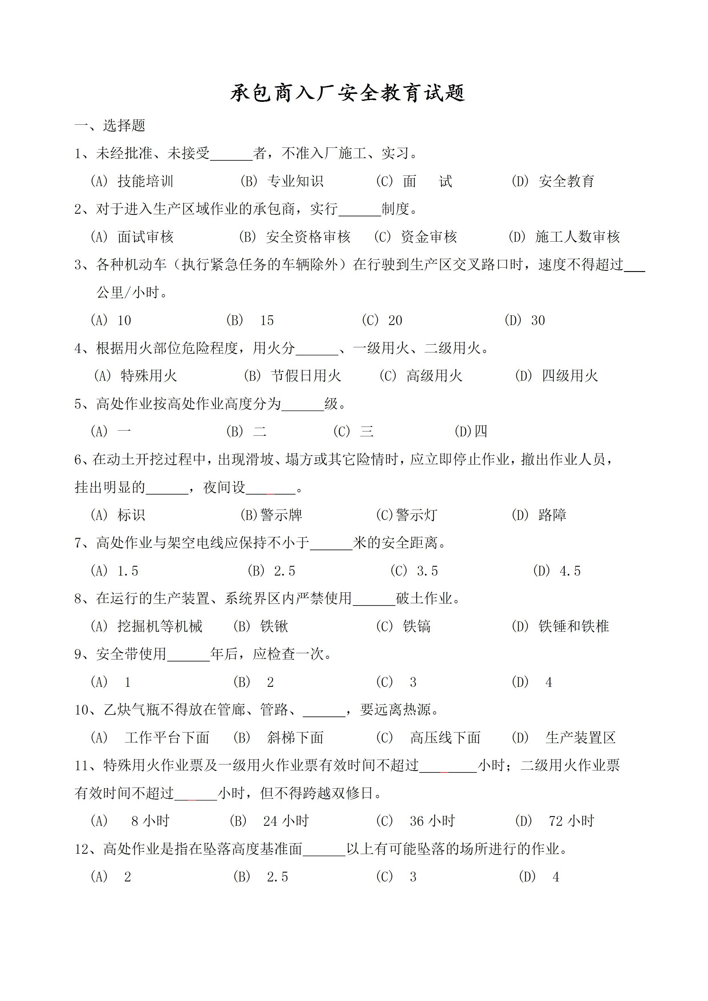 / 承包商入厂安全教育培训考试题带答案[文档]