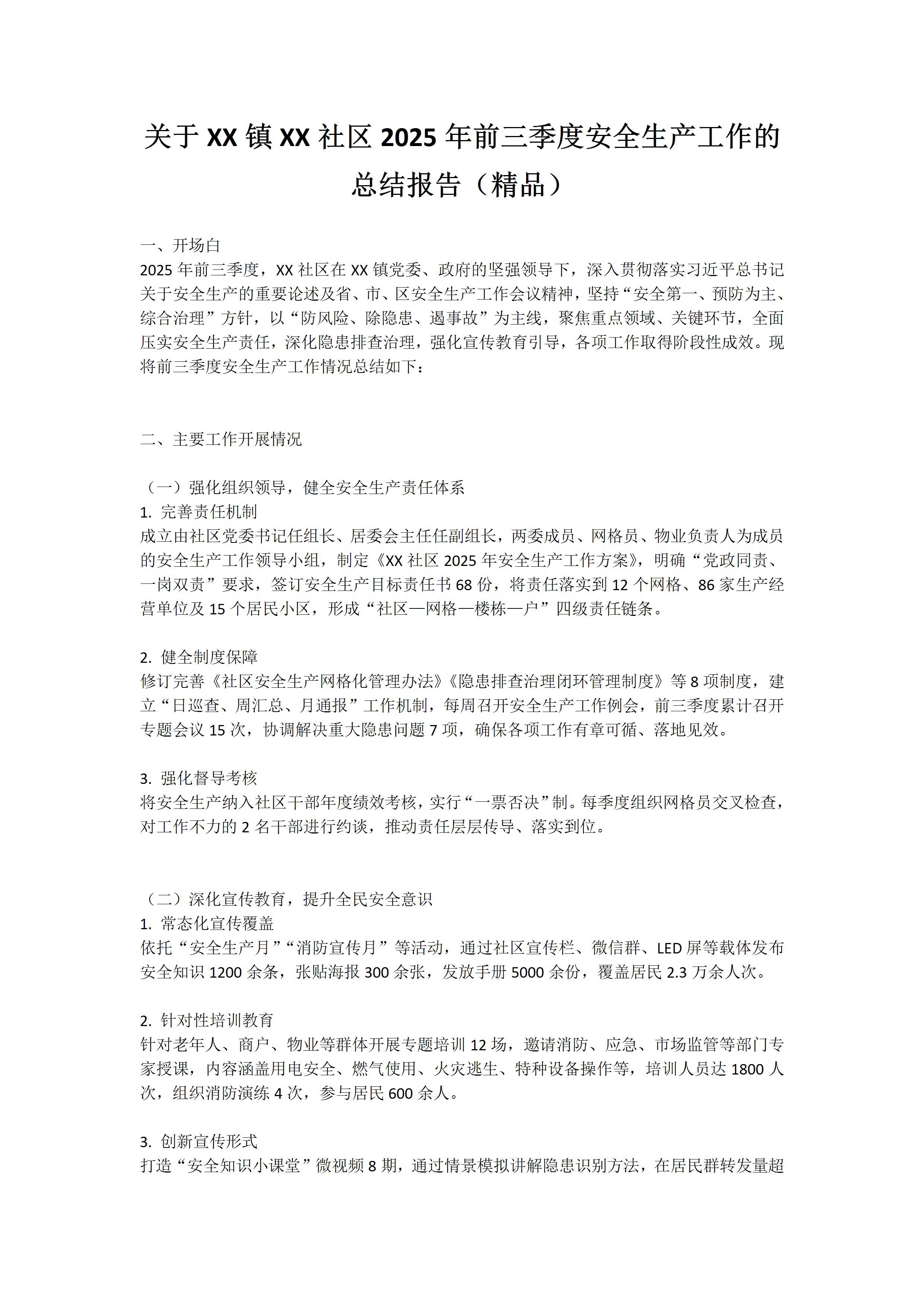/ 关于镇社区2025年前三季度安全生产工作的总结报告模板文档