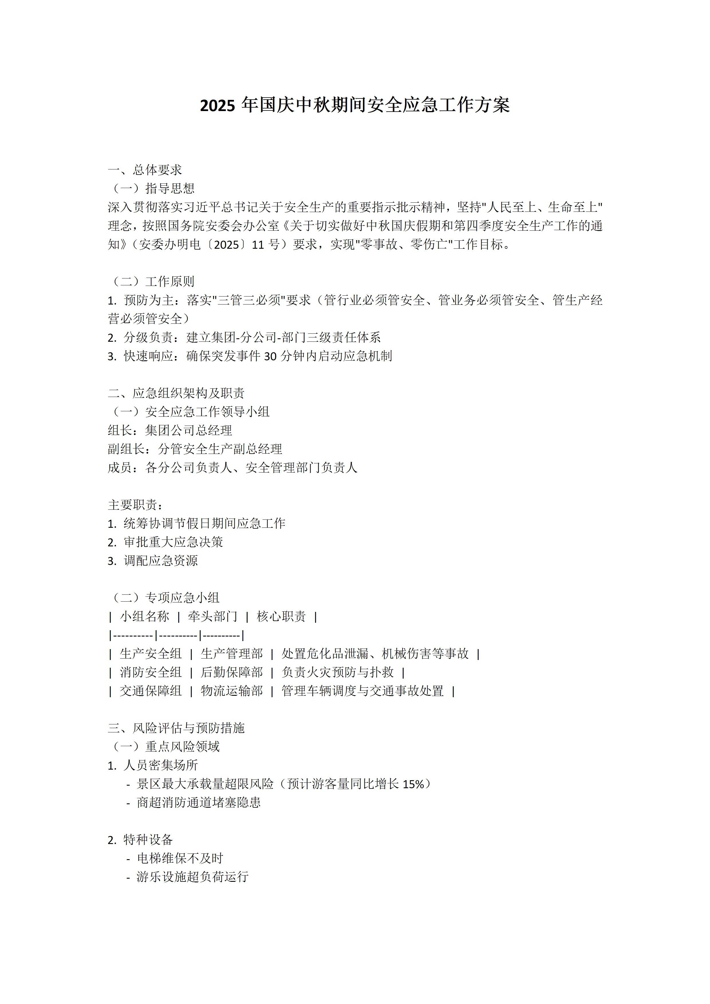 / 2025年国庆中秋期间安全应急工作方案模板文档