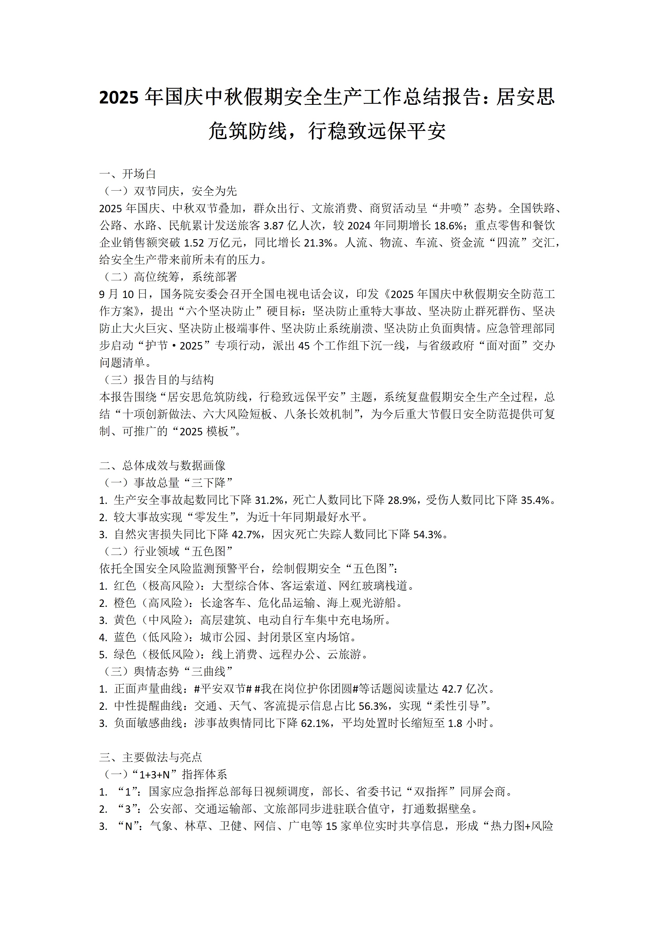 2025年国庆中秋假期安全生产工作总结报告居安思危筑防线,行稳致远保平安 文档25.10.12