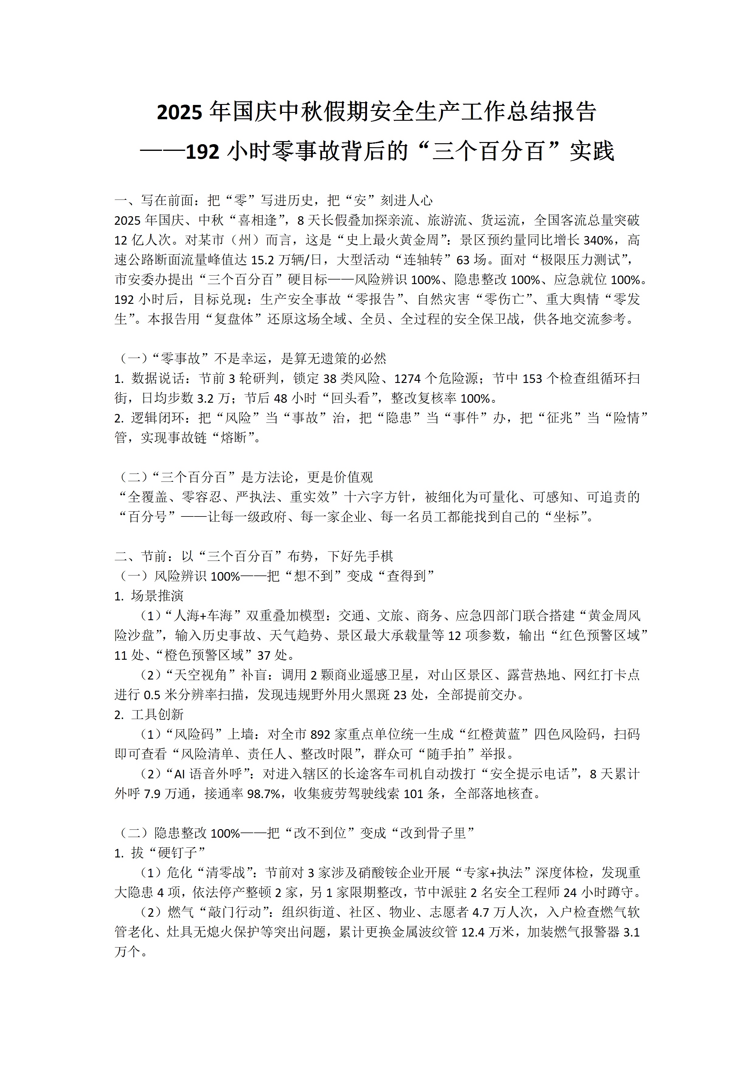 2025年国庆中秋假期安全生产工作总结报告——192小时零事故背后的“三个百分百”实践