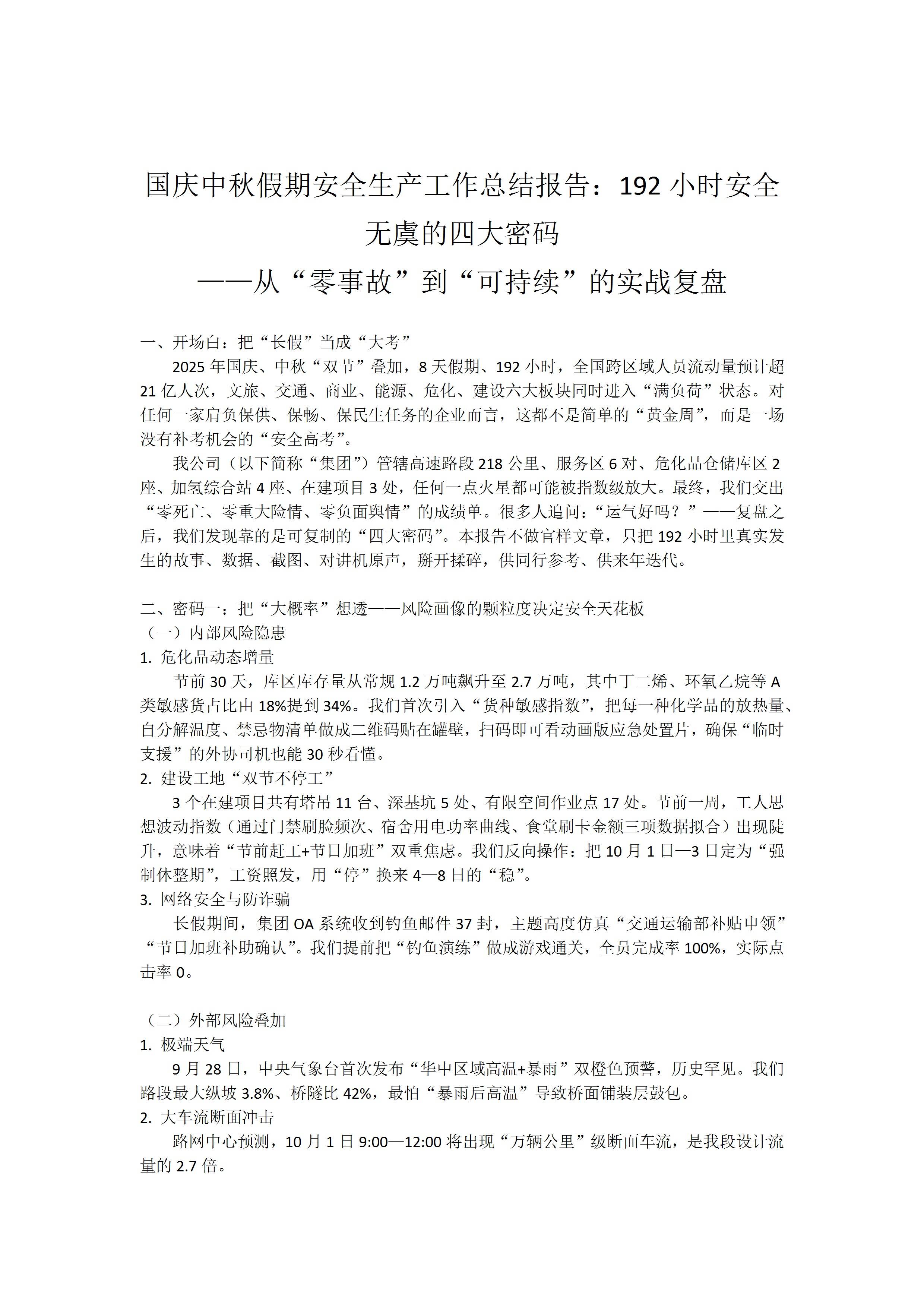 国庆中秋假期安全生产工作总结报告192小时安全无虞的四大密码从“零事故”到可持续的实战复盘文档 25.10.13