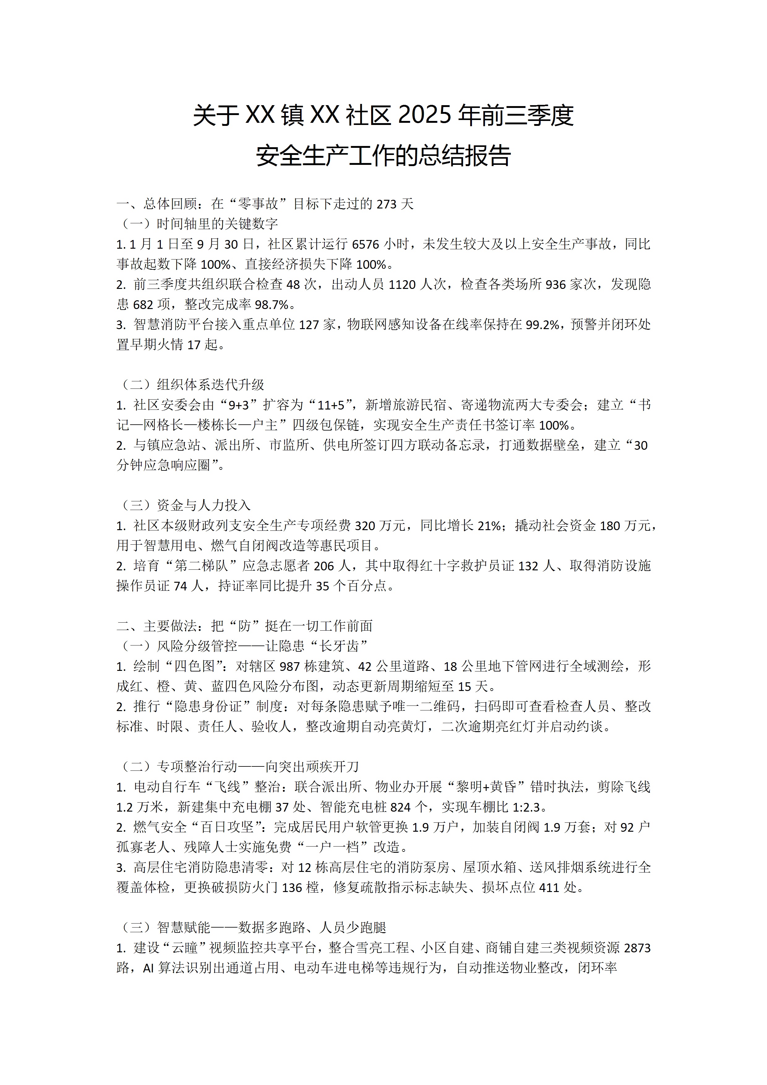 关于XX镇XX社区2025年前三季度安全生产工作的总结报告 文档25.10.15