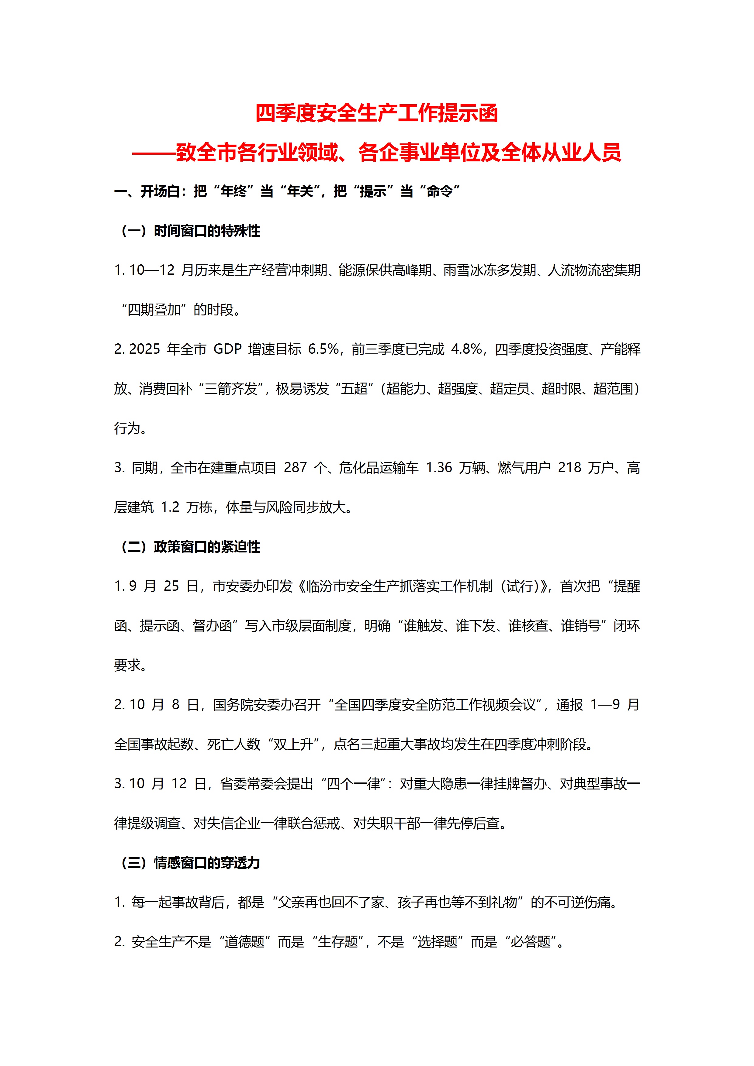 四季度安全生产工作提示函致全市各行业领域,各企事业单位及全体从业人员 文档25.10.15