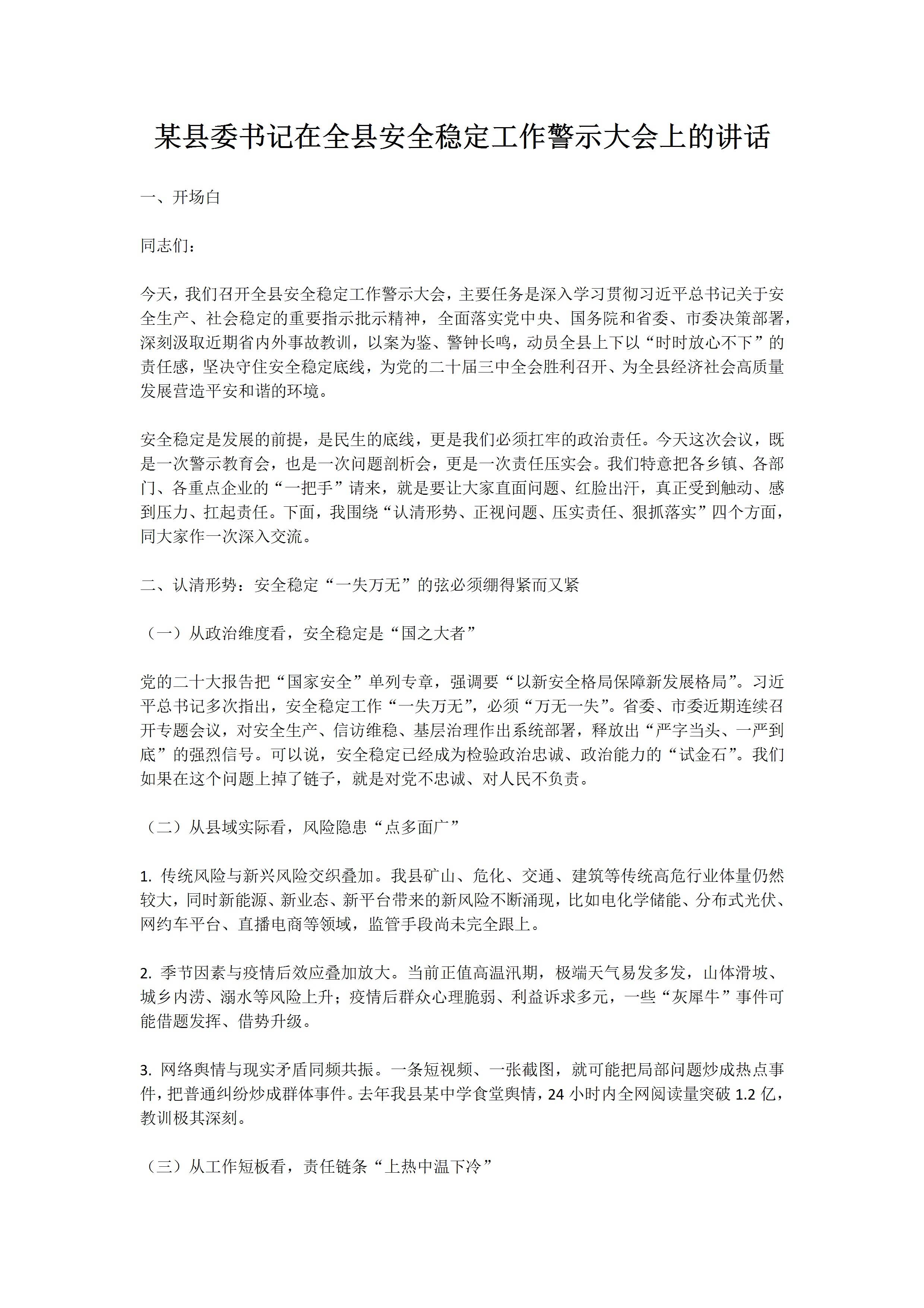 / 某县委书记在全县安全稳定工作警示大会上的讲话 文档25.10.16