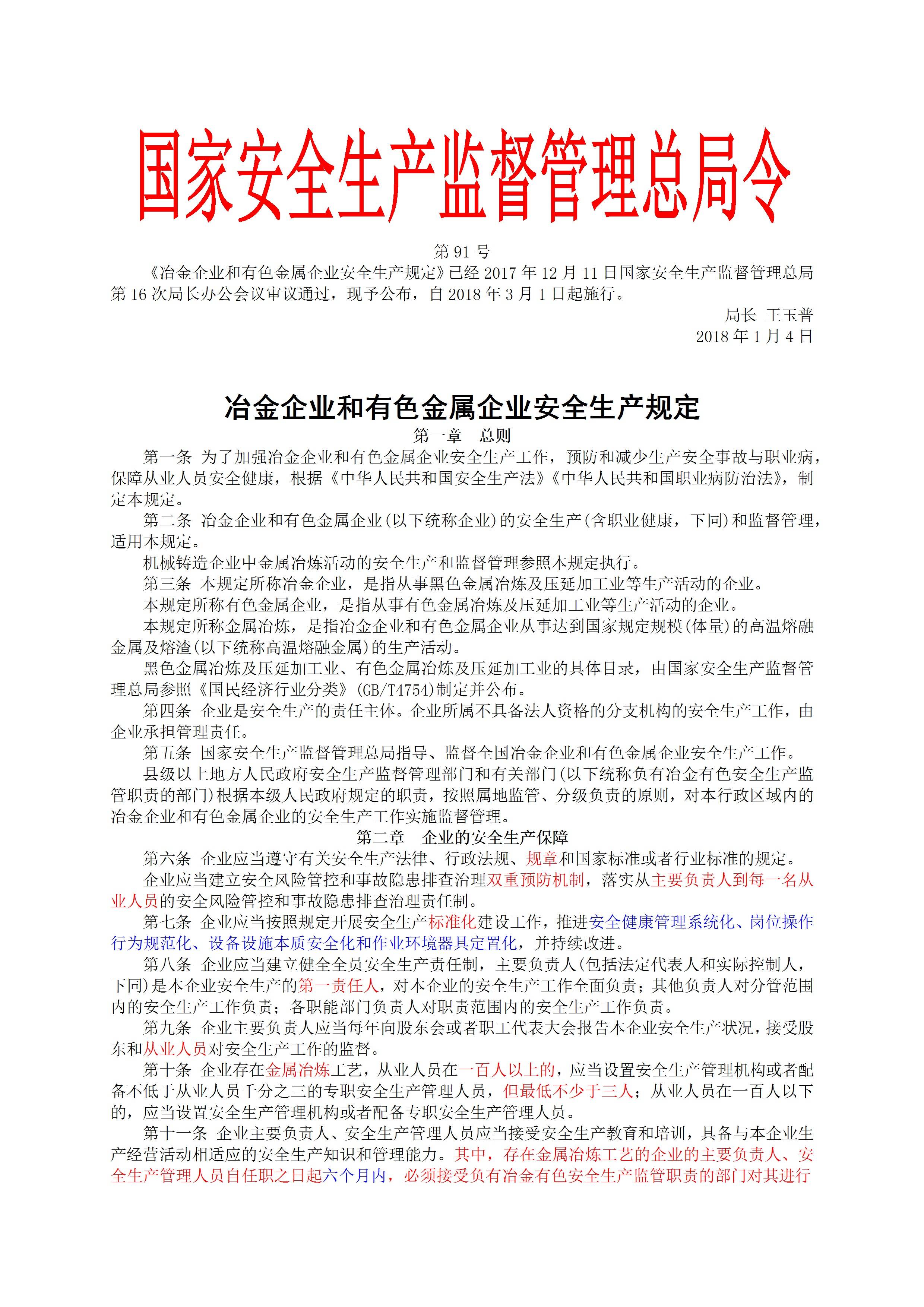 国家安监总局令[2018]第91号冶金企业和有色金属企业安全生产规定
