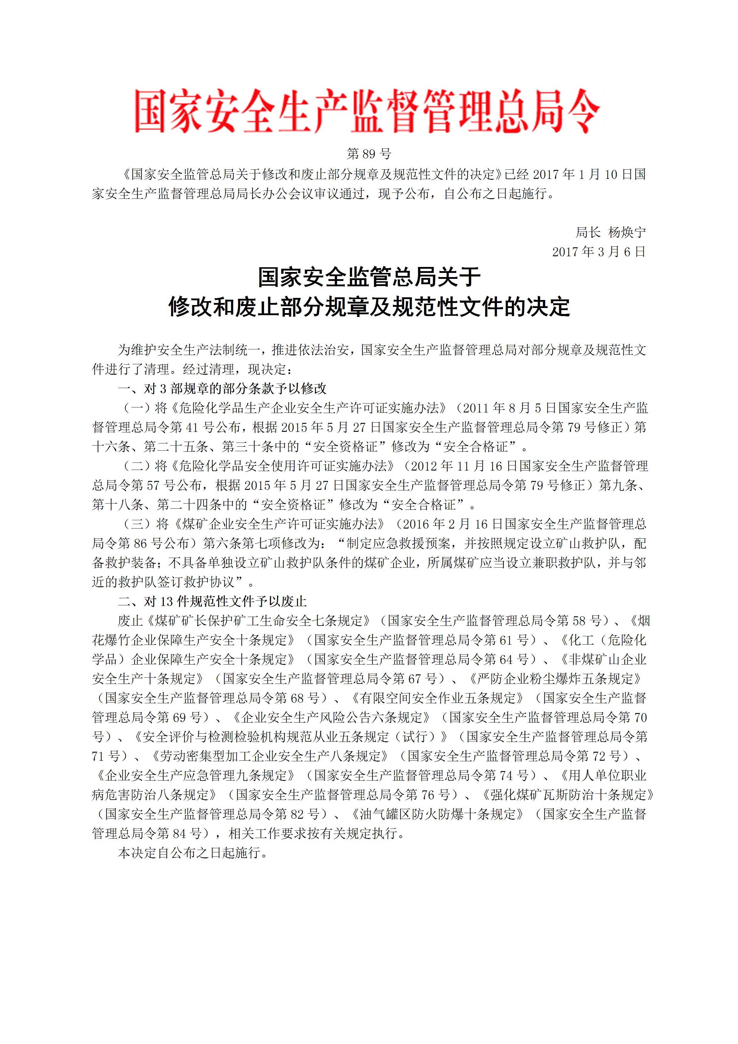 国家安监总局令[2017]第89号关于修改和废止部分规章及规范性文件的决定