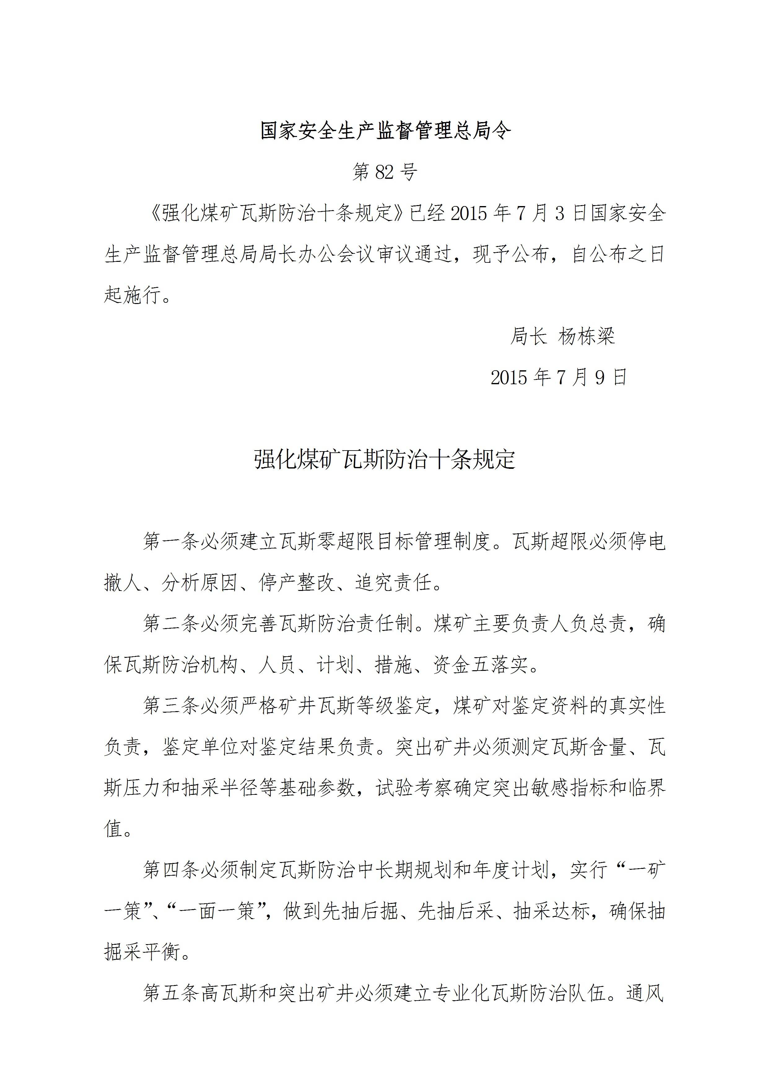 / 国家安监总局令[2015]第82号《强化煤矿瓦斯防治十条规定》