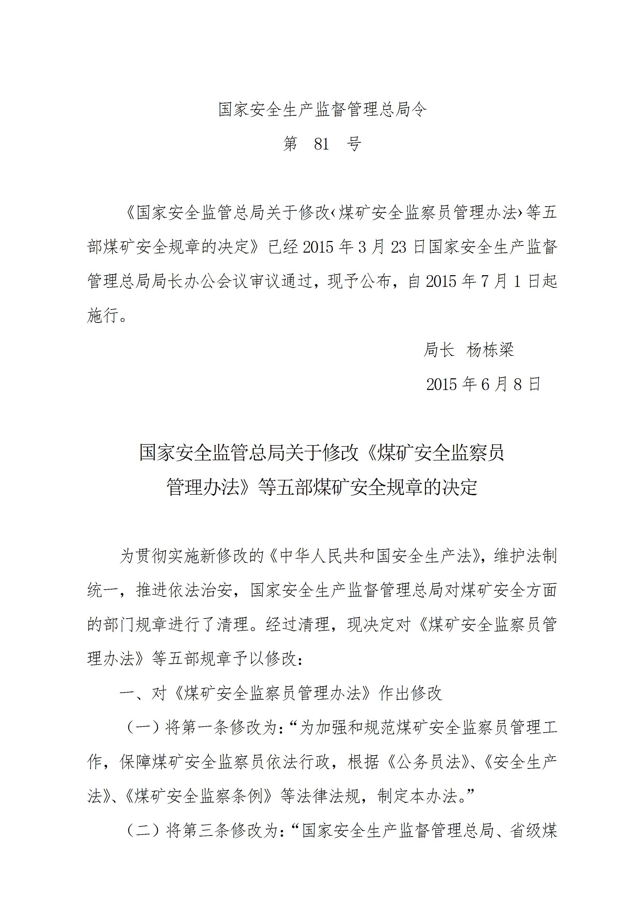 国家安监总局令[2015]第81号《关于修改煤矿安全监察员管理办法等五部煤矿安全规章的决定》