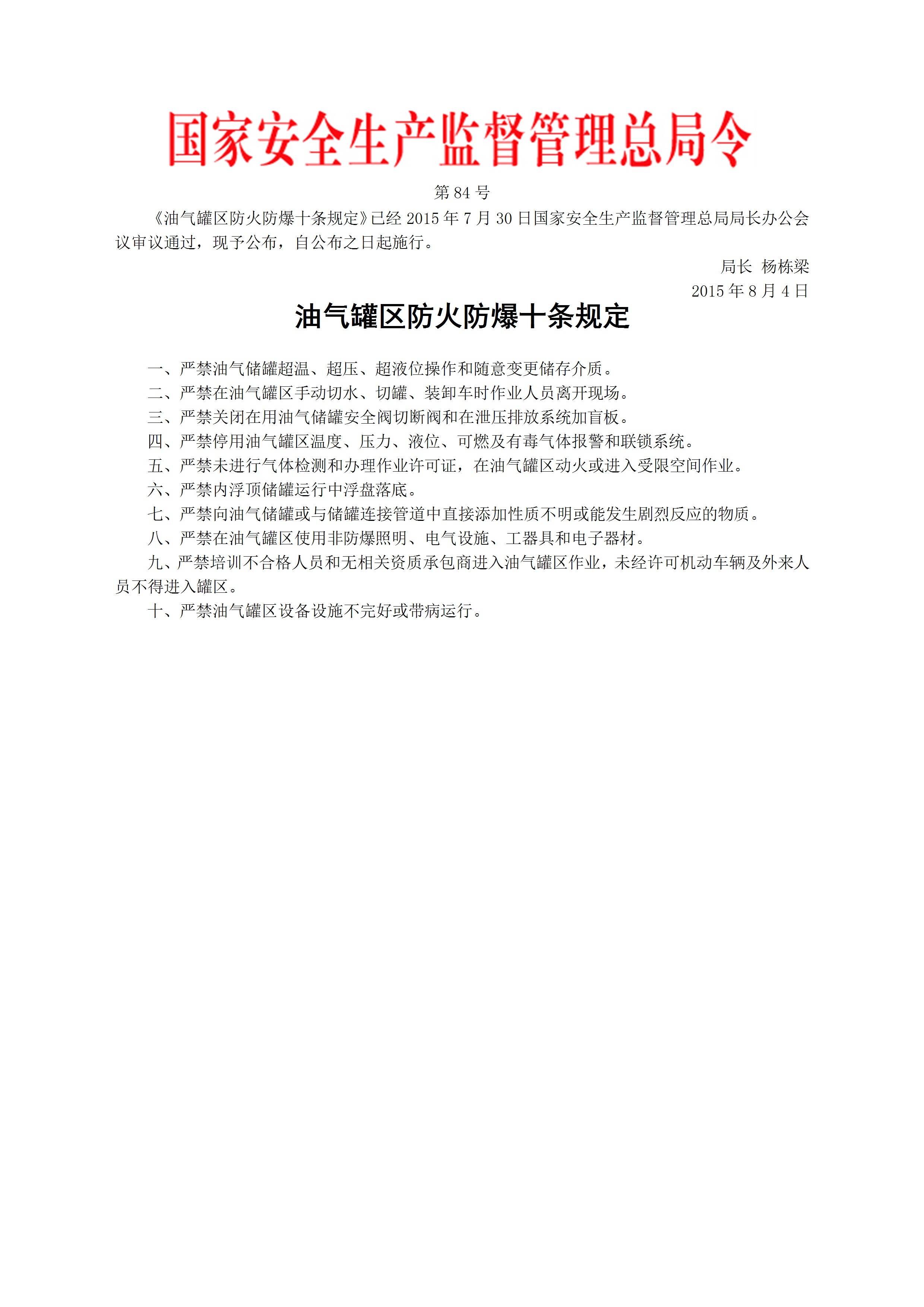 国家安监总局令[2015]第84号油气罐区防火防爆十条规定(国家安监总局令[2017]第89号废止)