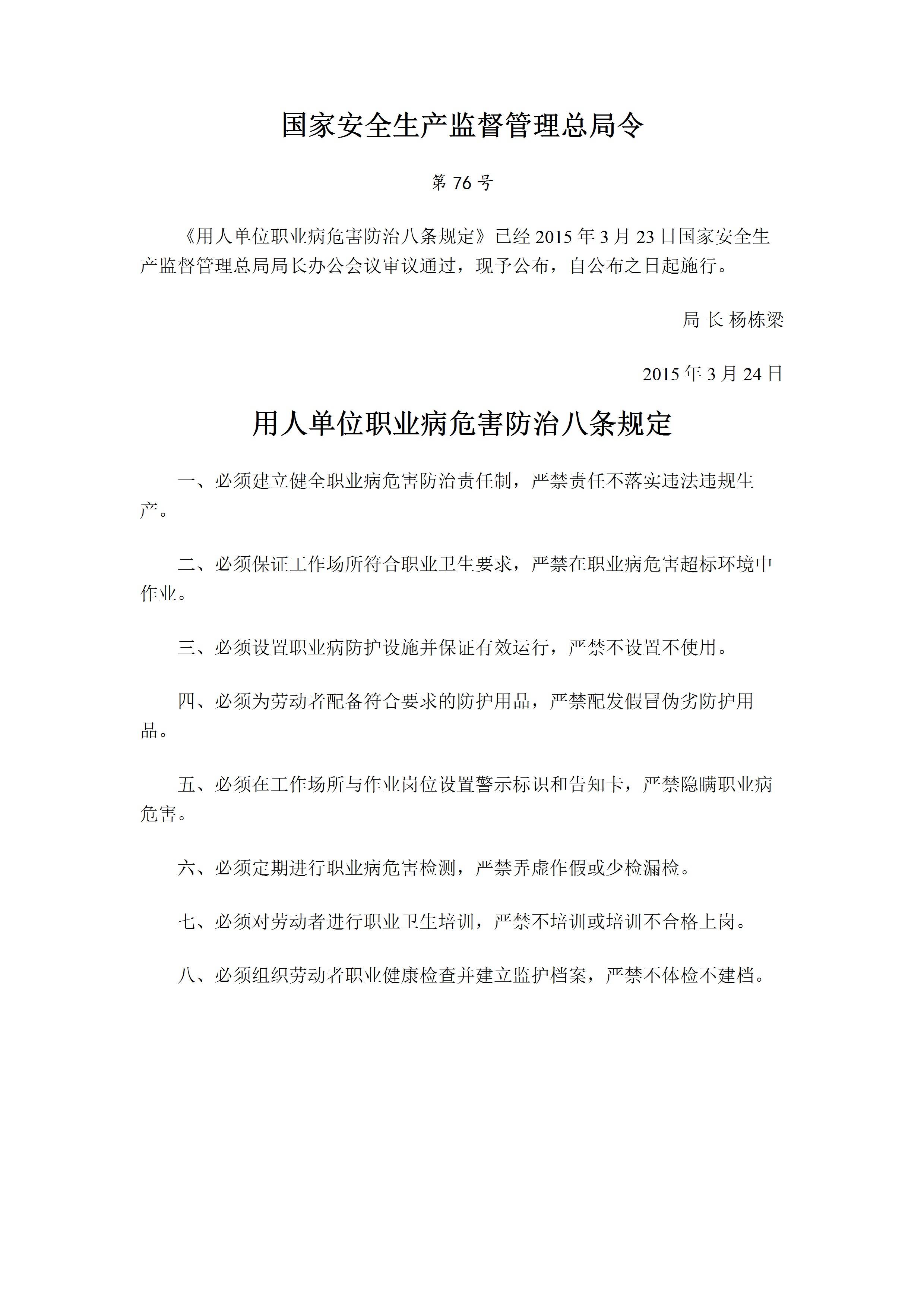 / 国家安监总局令[2015]第76号《用人单位职业病危害防治八条规定》