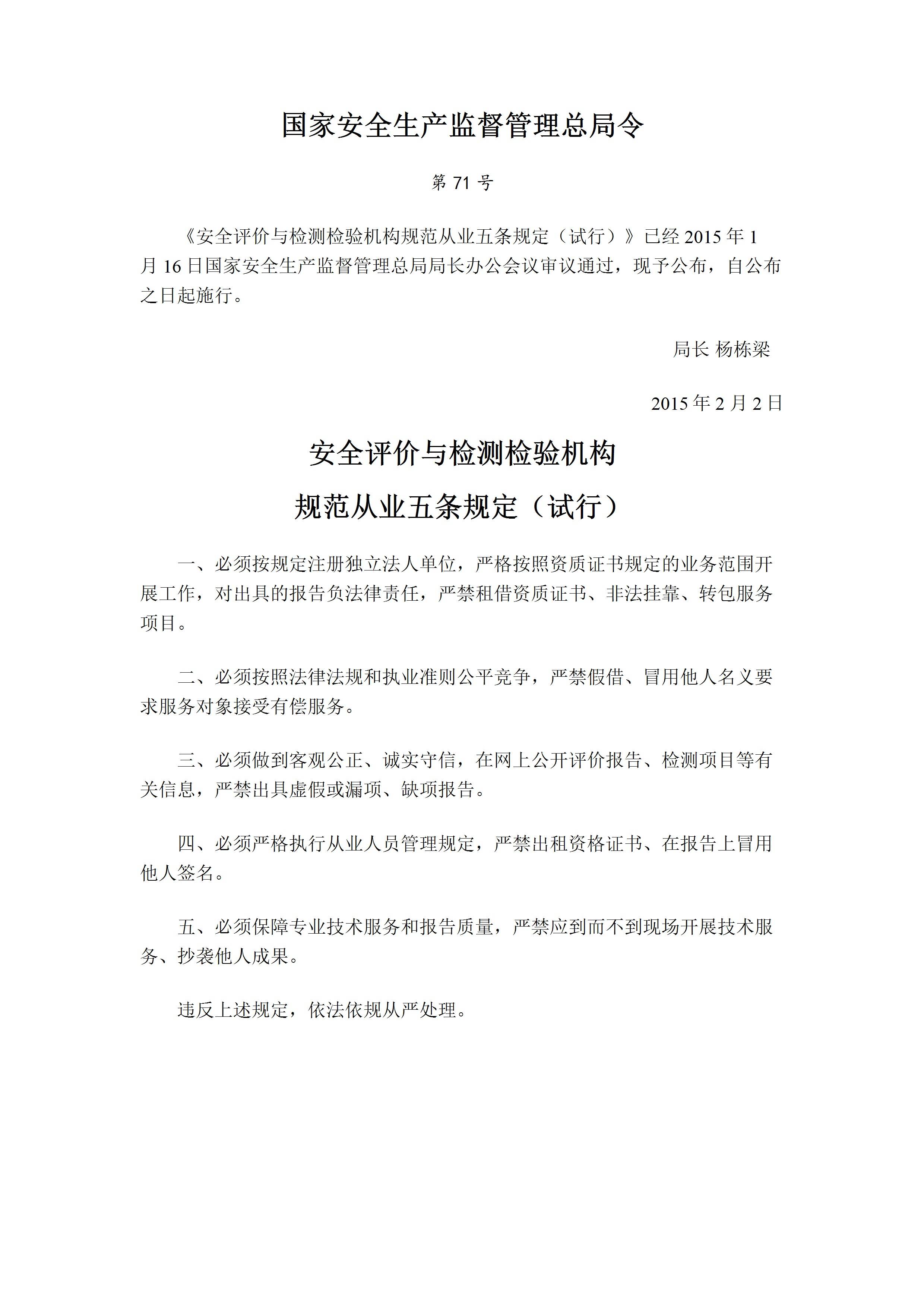 国家安监总局令[2015]第71号《安全评价与检测检验机构规范从业五条规定(试行)》