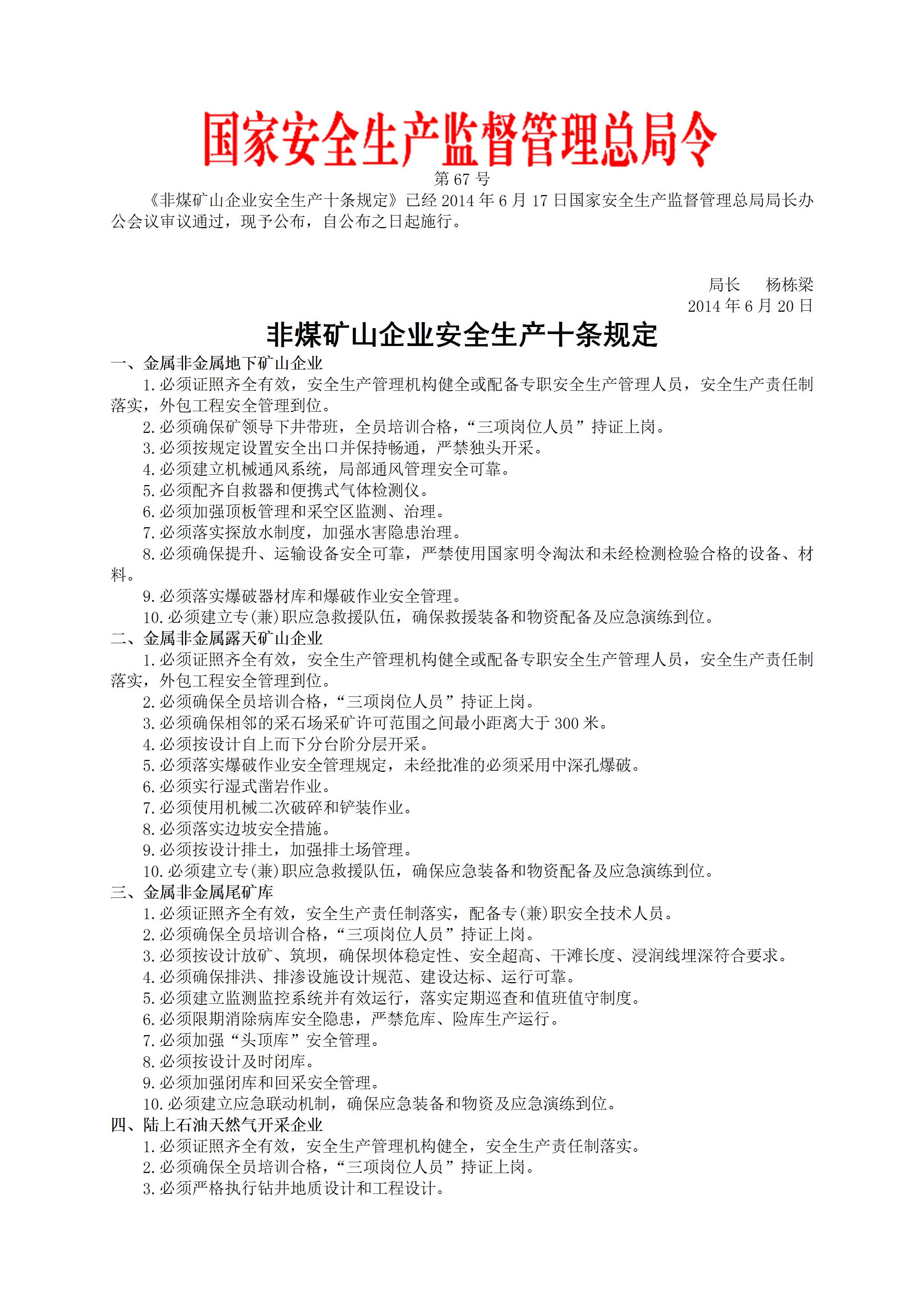 国家安监总局令[2014]第67号非煤矿山企业安全生产十条规定(国家安监总局令[2017]第89号废止)